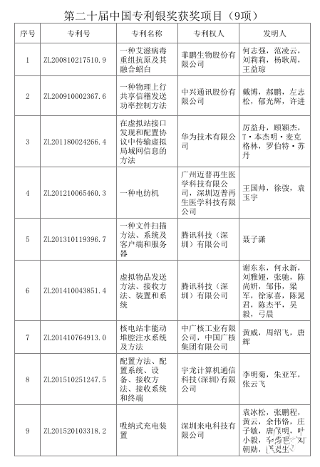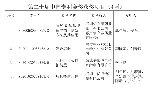 深圳市市场监管局(市知识产权局)分析称,深圳企业专利获奖占全国、全省比例较大,表明深企在研发创新方面继续保持领先优势。其中,华为、中兴、腾迅、比亚迪等核心重点企业表现稳定,依然是各类专利榜单的“常客”;与此同时,越来越多的生力军加入自主创新队伍,比如此次获中国专利金奖的企业中,除信立泰曾获第17届中国专利奖金奖外,其余3家企业均为首次获得该项金奖。