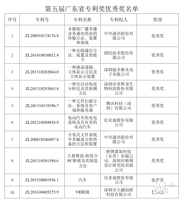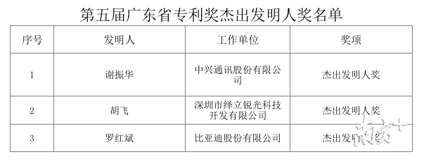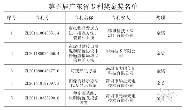 在第五届(2018年)广东省专利奖中,深圳获得5项广东专利金奖,获奖单位分别为腾讯科技(深圳)有限公司、华为技术有限公司、深圳市大疆创新科技有限公司、深圳市华星光电技术有限公司、深圳市光峰光电技术有限公司;3项杰出发明人奖分别为中兴通讯股份有限公司的谢振华、深圳市绎立锐光科技开发有限公司的胡飞、比亚迪股份有限公司的罗红斌。