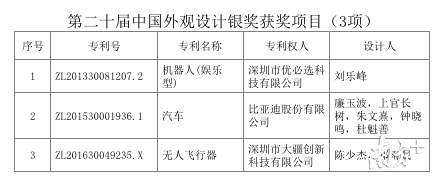 据了解,中国专利奖由国家知识产权局与世界知识产权组织共同开展评选工作,每年举办一届,是我国专利领域最高奖项。在第20届中国专利奖榜单中,深圳企业获得中国专利金奖4项,获奖单位分别为深圳信立泰药业股份有限公司、主力智业(深圳)电器实业有限公司、源德盛塑胶电子(深圳)有限公司、深圳市优必选科技有限公司。深圳企业同时还获得中国专利银奖9项、中国外观设计银奖3项、中国专利优秀奖54项、中国外观设计优秀奖8项。