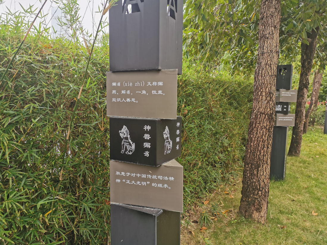 “獬豸,又称獬廌、解豸,一角,性直,能识人善恶。取意于对中国传统司法精神‘正大光明’的继承。”走在深圳市福田区益田法治文化公园的“法之路”上,不仅能够放松身心,还能从装饰上学到各种趣味法律知识。这个以“法治”为主题的公园深受附近居民的喜爱。
