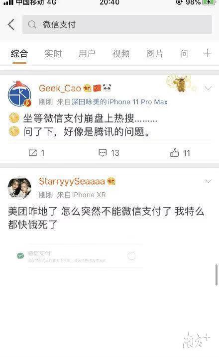 微博实时搜索显示,已有不少用户在昨晚受到此故障影响。而从用户的反馈来看,微信支付已成为他们不可或缺的工具。据今年易观发布的《中国第三方支付移动支付市场季度监测报告》显示,2019年第一季度,中国移动支付市场规模达到近47.7万亿元,其中支付宝以53.21%的份额继续位列第一,腾讯金融39.44%继续位列第二,后者的主体则是微信支付。