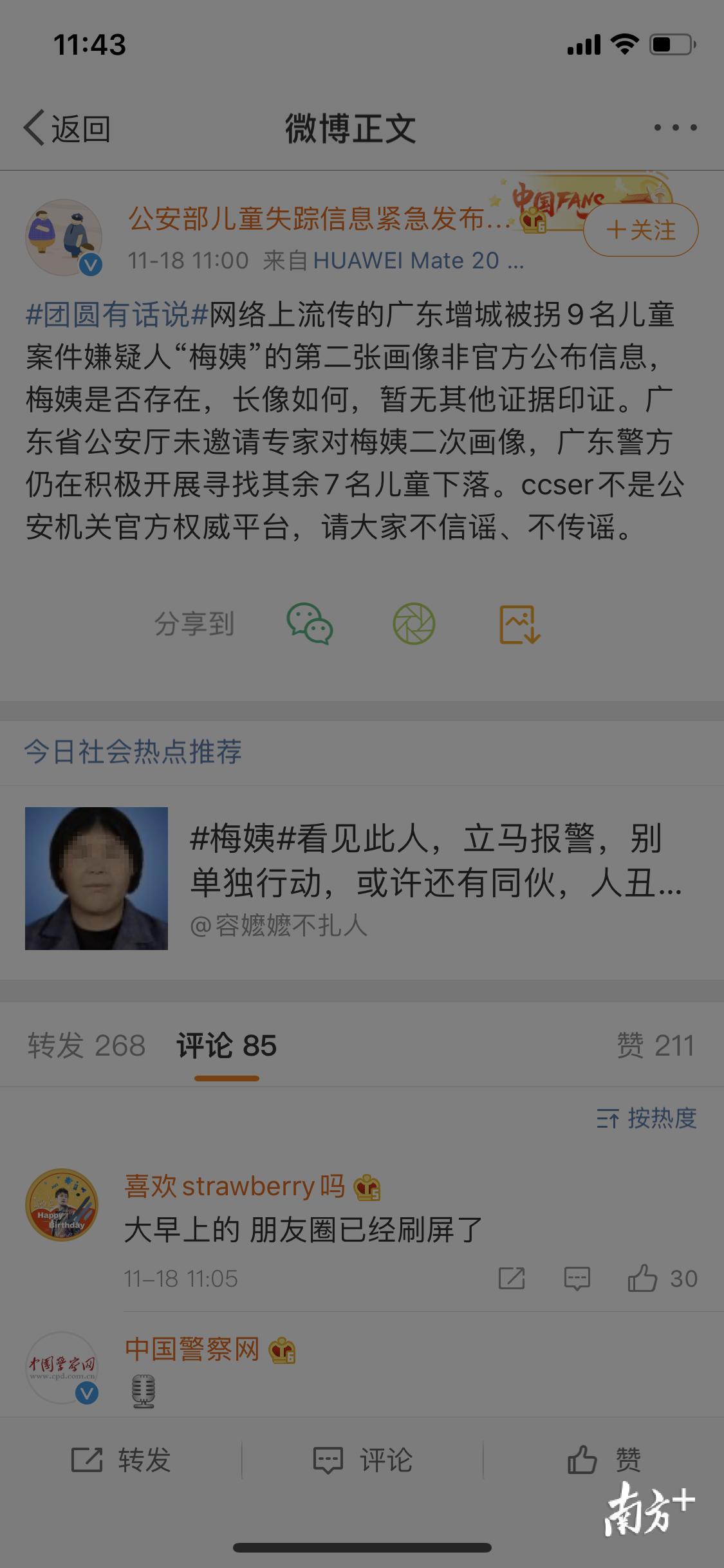 官方微博@公安部儿童失踪信息紧急发布平11月18日11时许发布消息,对上述传闻及时予以回应,内容如下:
