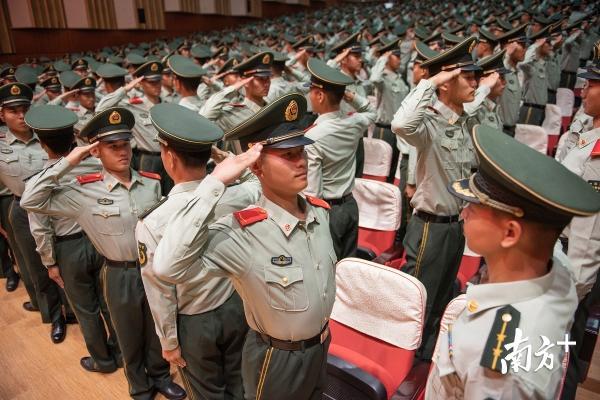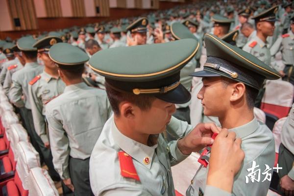 在庄严的国歌声后,全体新训干部骨干为新兵佩戴军衔和帽徽。“这是新兵最好的成人礼”,新训六中队指导员白景龙说,“在军旅生涯的新起点上,他们将扛起接力棒,在一国两制的前沿阵地,肩负起维护粤港粤澳繁荣稳定的重任。”