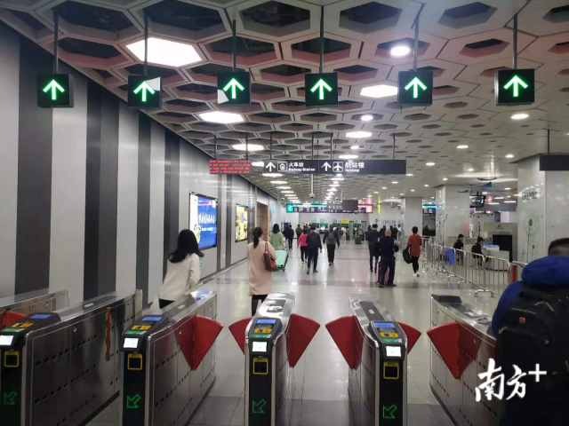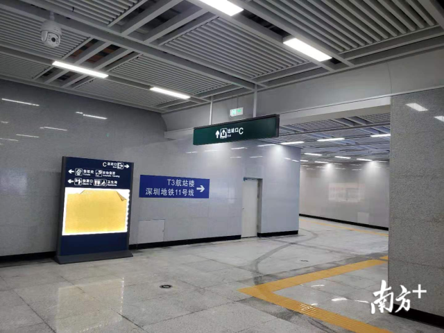 从深圳机场航站楼2层到达大厅出发,乘坐电梯前往负一层,便可无缝接驳深圳地铁11号线机场站,通过约长500米的连接通道,便可直通穗深城际深圳机场站,实现空铁联运。