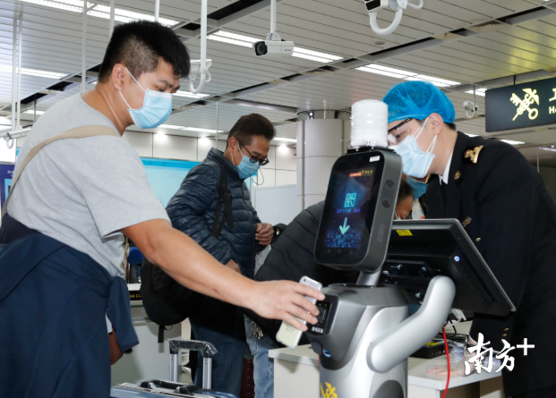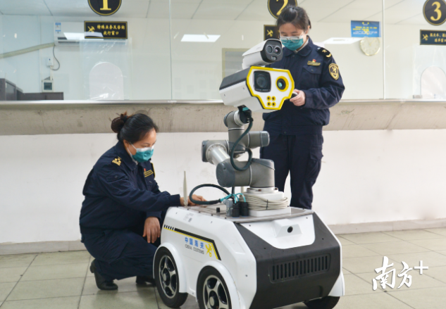 在文锦渡口岸,机器人“安安”在查验台上来回“走动”,对查验区人员开展体温监测,并广播防疫注意事项。