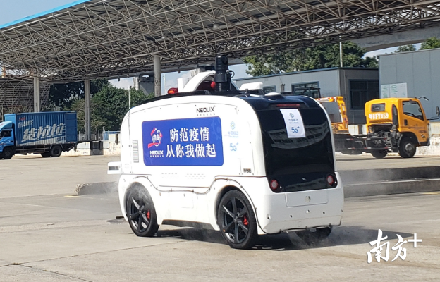 在深圳出口加工区,一辆无人防疫车自动行走在查验场站、园区道路、园区各企业办公楼以及车间等地。这是深圳海关派出的“5G+无人防疫车”,对出口加工区开展智慧消杀以及防疫宣传。