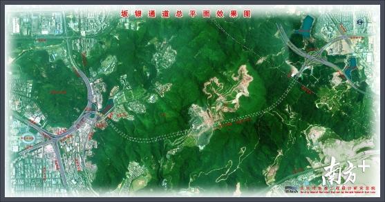 坂银通道工程南起黄木岗立交北侧,向北经泥岗立交沿北环大道西侧高架布置,上跨北环大道后以下沉隧道方式穿越金湖调蓄湖水库,继续下穿银湖路进入鸡公山,下穿下坪垃圾填埋场后上跨厦深铁路梅林隧道,出隧道后上跨南坪快速,向北接坂雪岗大道,终至环城南路路口,主线长约7.643公里。
