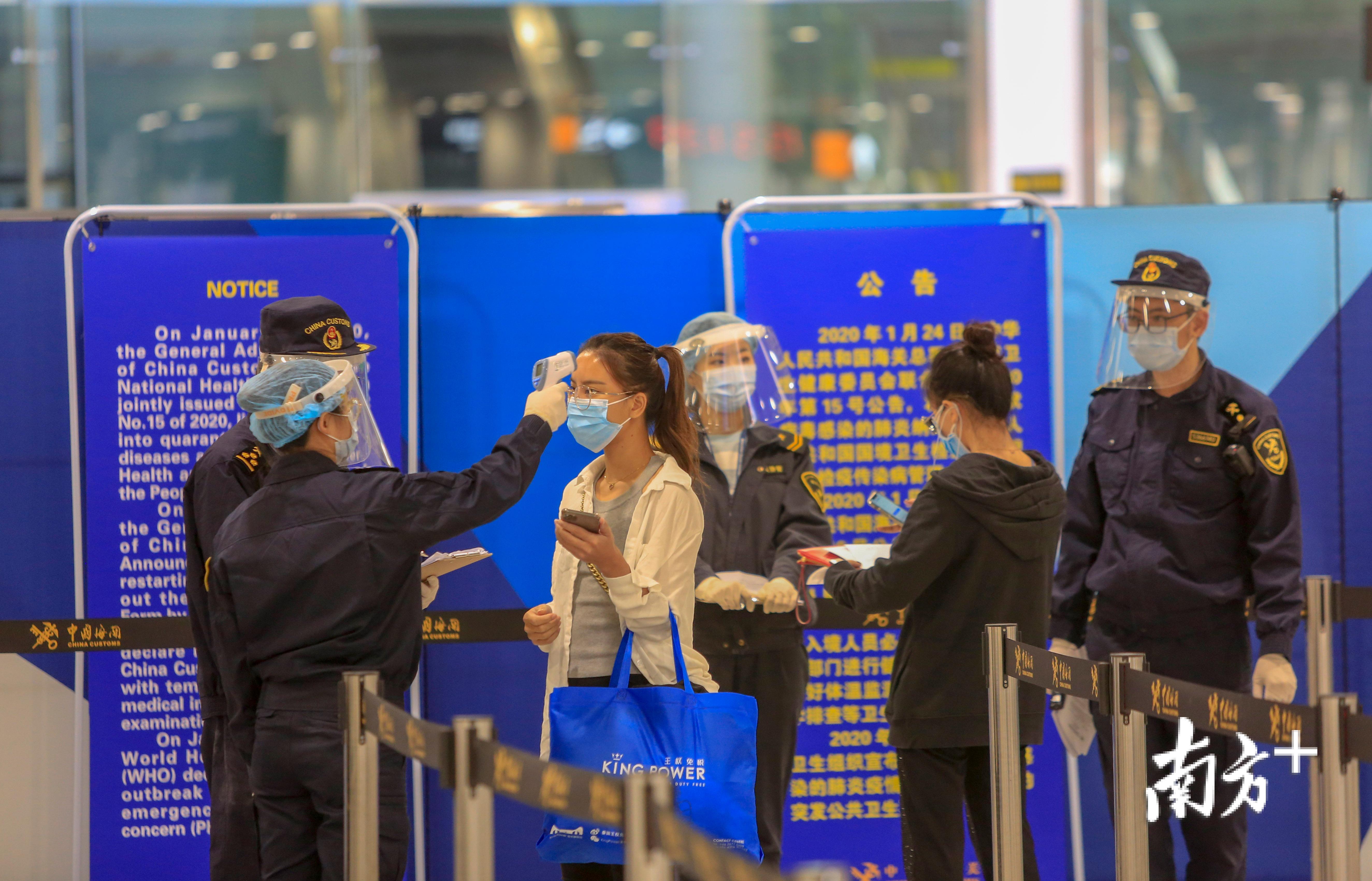 3月16日,在深圳宝安机场,国际航班一落地,海关关员手拿测温枪、戴着口罩、穿着防护服登上飞机,对入境旅客进行检疫。其实,一落地就接受卫生检疫只是旅客入境深圳的第一步。