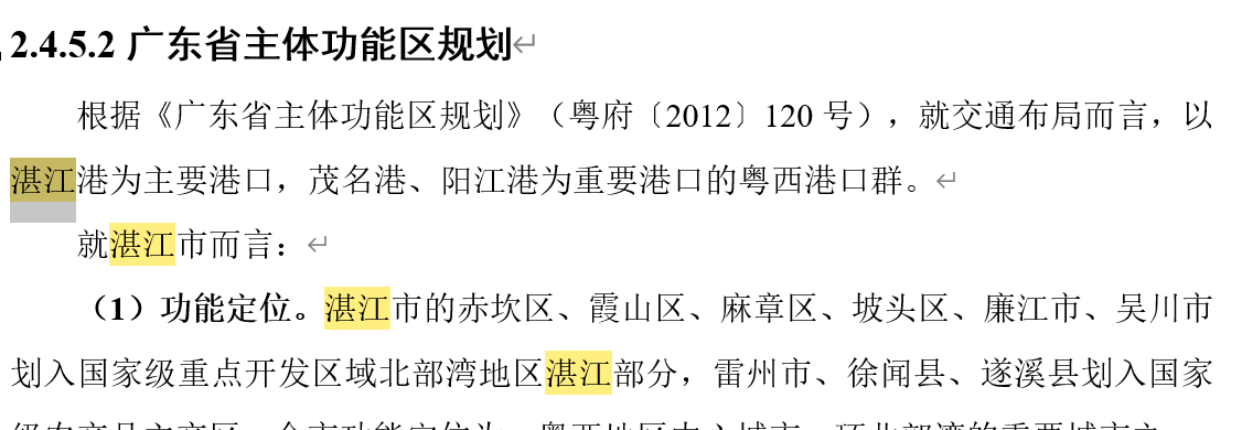 而在“2.4.5.2广东省主体功能区规划”一章节中,报告全段以湛江市为阐述对象,对湛江湾的功能定位、提升拓展地区和重点保护地区开展论述。