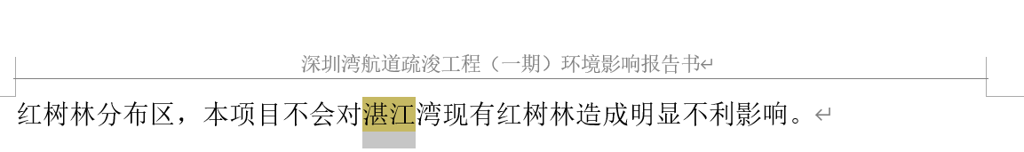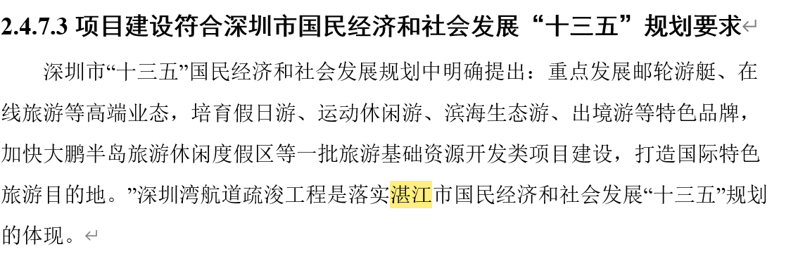 环评报告内文多处提及“湛江港”,甚至出现“深圳湾航道疏浚工程是落实湛江市国民经济和社会发展‘十三五’规划的体现”“开展30万吨级航道改扩建工作,符合湛江市关于综合交通的规划布局”等表述。