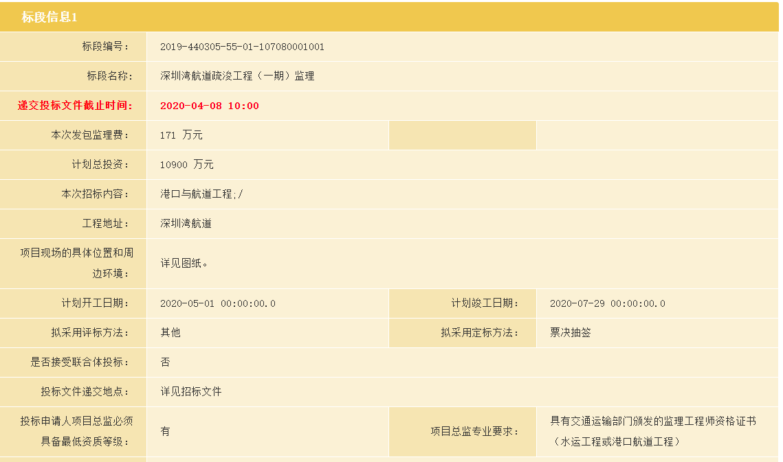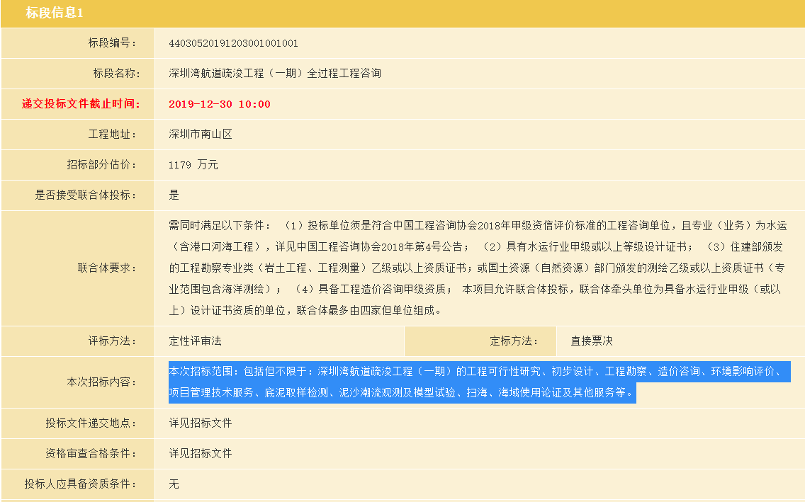 笔者查询政府官网发现,深圳湾航道疏浚工程(一期)建设单位为广东省深圳航道事务中心,计划总投资1.09亿元,全过程工程咨询中标单位为中交水运规划设计院有限公司,中标价格990.36万元,招标内容包括工程可行性研究、初步设计、工程勘察、造价咨询、环境影响评价、底泥取样检测等服务。
