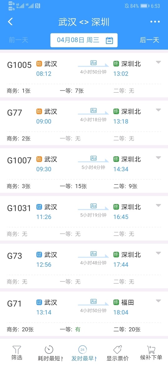 截至4月8日7时,有一趟车一等座、二等座已经全部售罄。此外,经过武汉终点站为深圳的列车共有11趟,只有一趟终点站为福田,其他列车的终点站均为深圳北站。