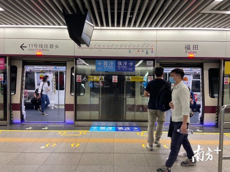 4月24日,记者在11号线福田站站台看到,车站的站台地面和站台门已经张贴了不少深蓝色的“强冷”和浅蓝色的“弱冷”的指示标识,根据标识的箭头指引,乘客可以选择自身所需的车厢方向。此外车站广播也均有相应的提醒。