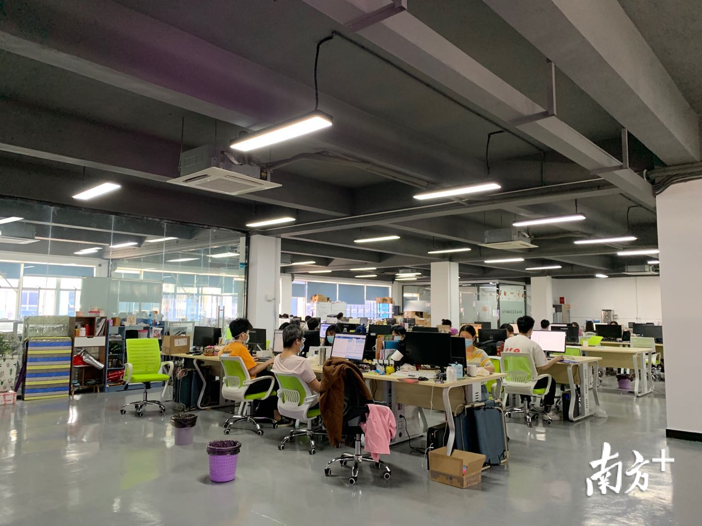 白色环形灯光线下,一个年轻女孩正在兴致勃勃地介绍一款灯具。直播间外,是坂田一处工业园厂房改造的开放式工作区,数百名年轻人正在电脑前处理电商业务。