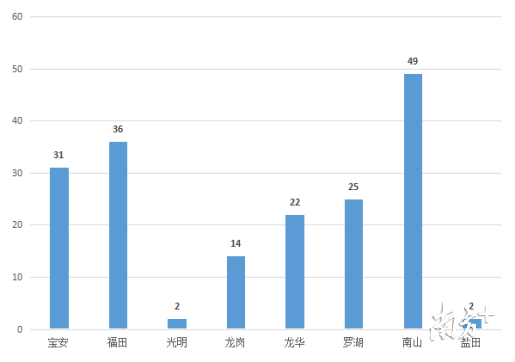 从区域分布来看,投诉活跃在前三名的行政区是:南山区(49条,占比27.1%)、福田区(36条,占比19.9%)以及宝安区(31条,占比17.1%)。