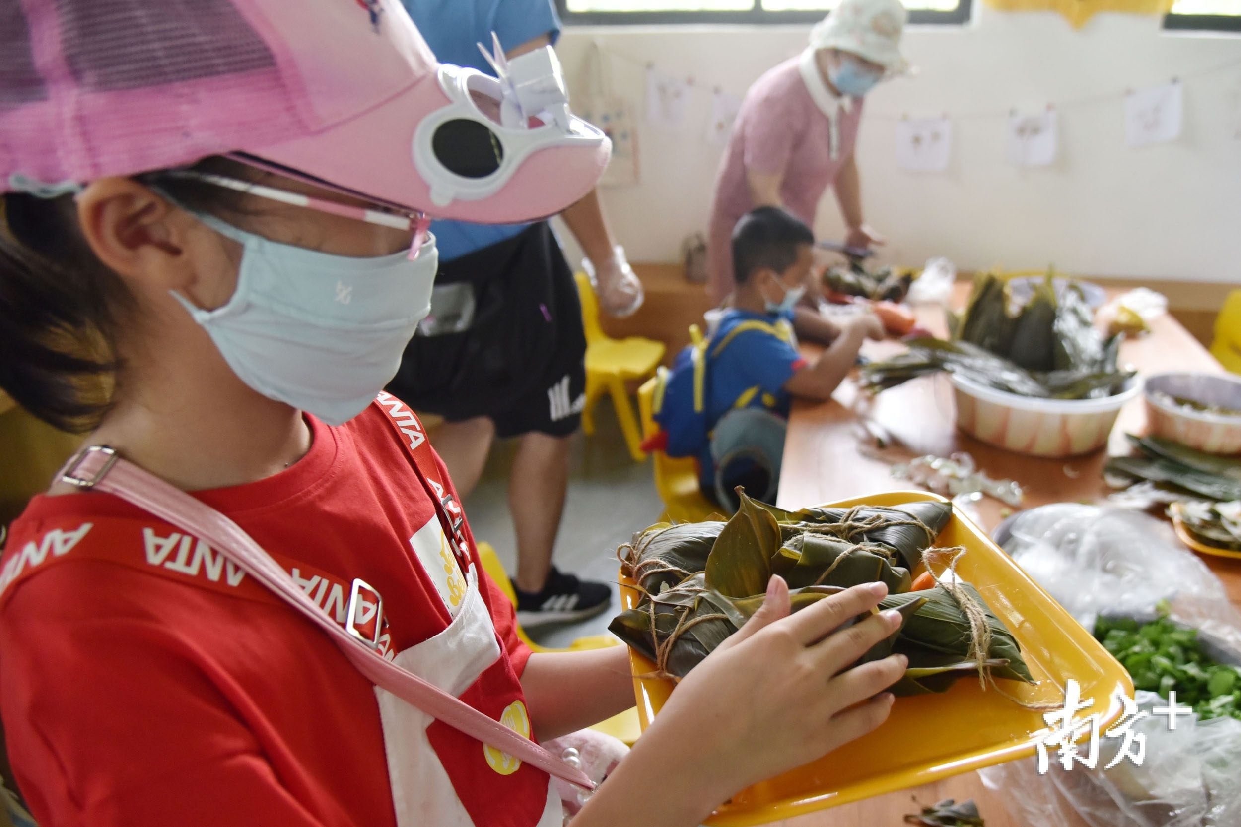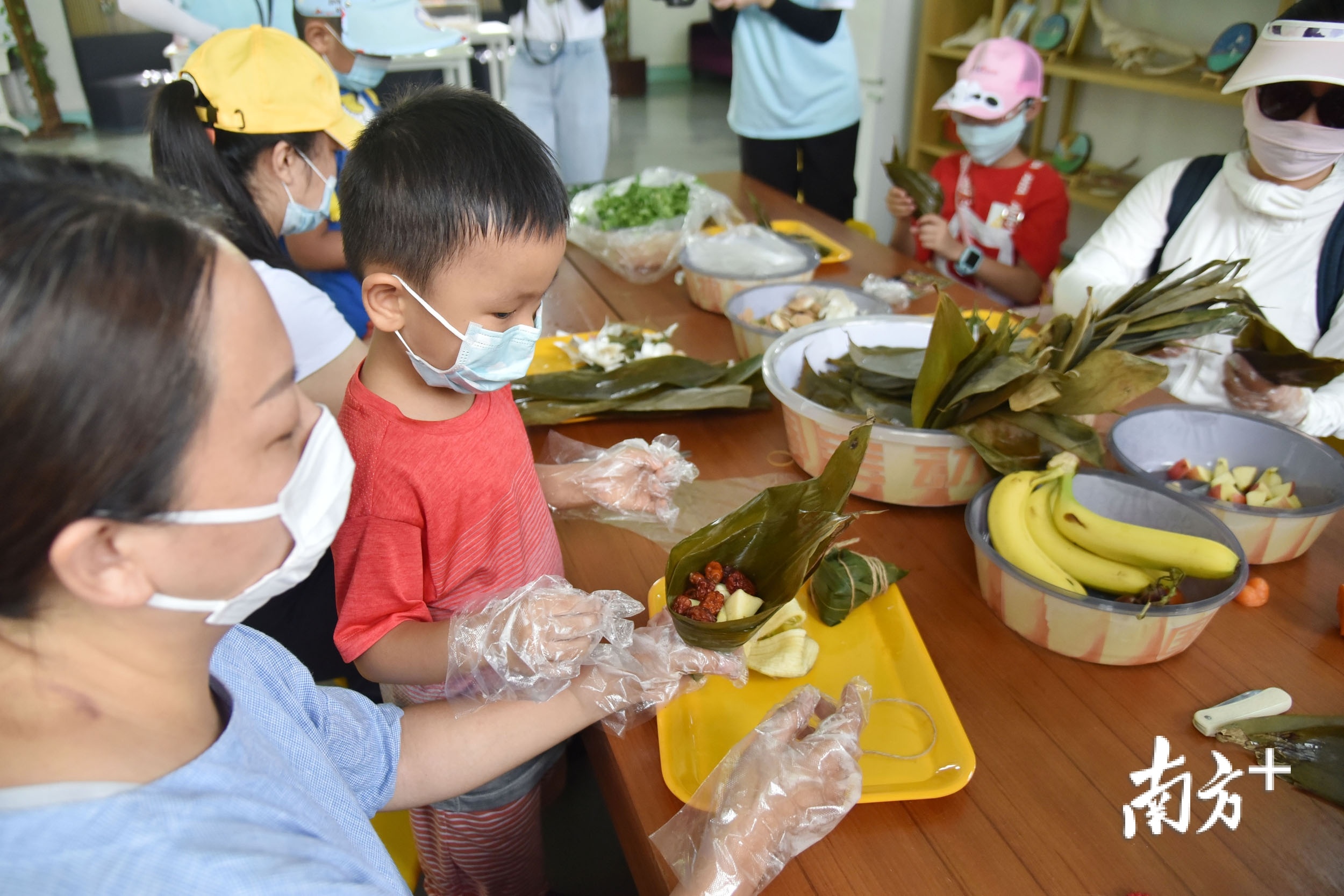 当日上午,动物园工作人员早早就准备了各种蔬果、颗粒料、蒜等食材。小朋友在工作人员的协助下,根据不同的饮食习性开始为长颈鹿、斑马、环尾狐猴等动物们包各种特色粽子。