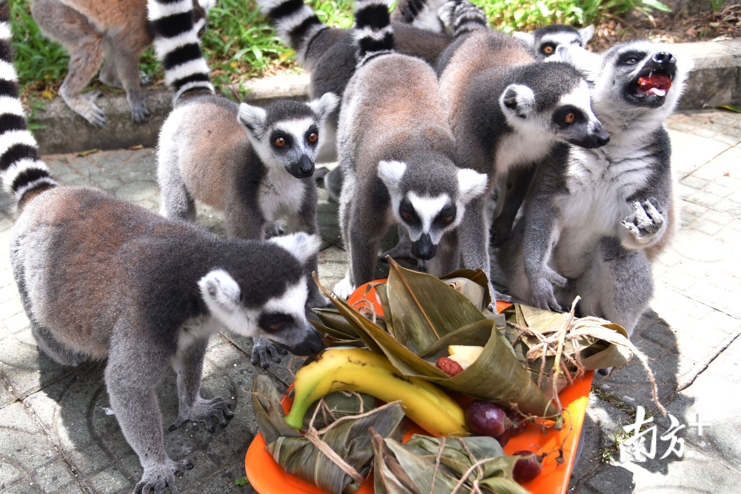 长颈鹿吃的粽子是由颗粒料、蒜、山楂、苹果等食物做成;斑马吃的粽子由红萝卜、颗粒料、青草、地瓜等食物做成;红枣、香蕉、提子、窝头等食材包成的粽子是环尾狐猴的最爱。