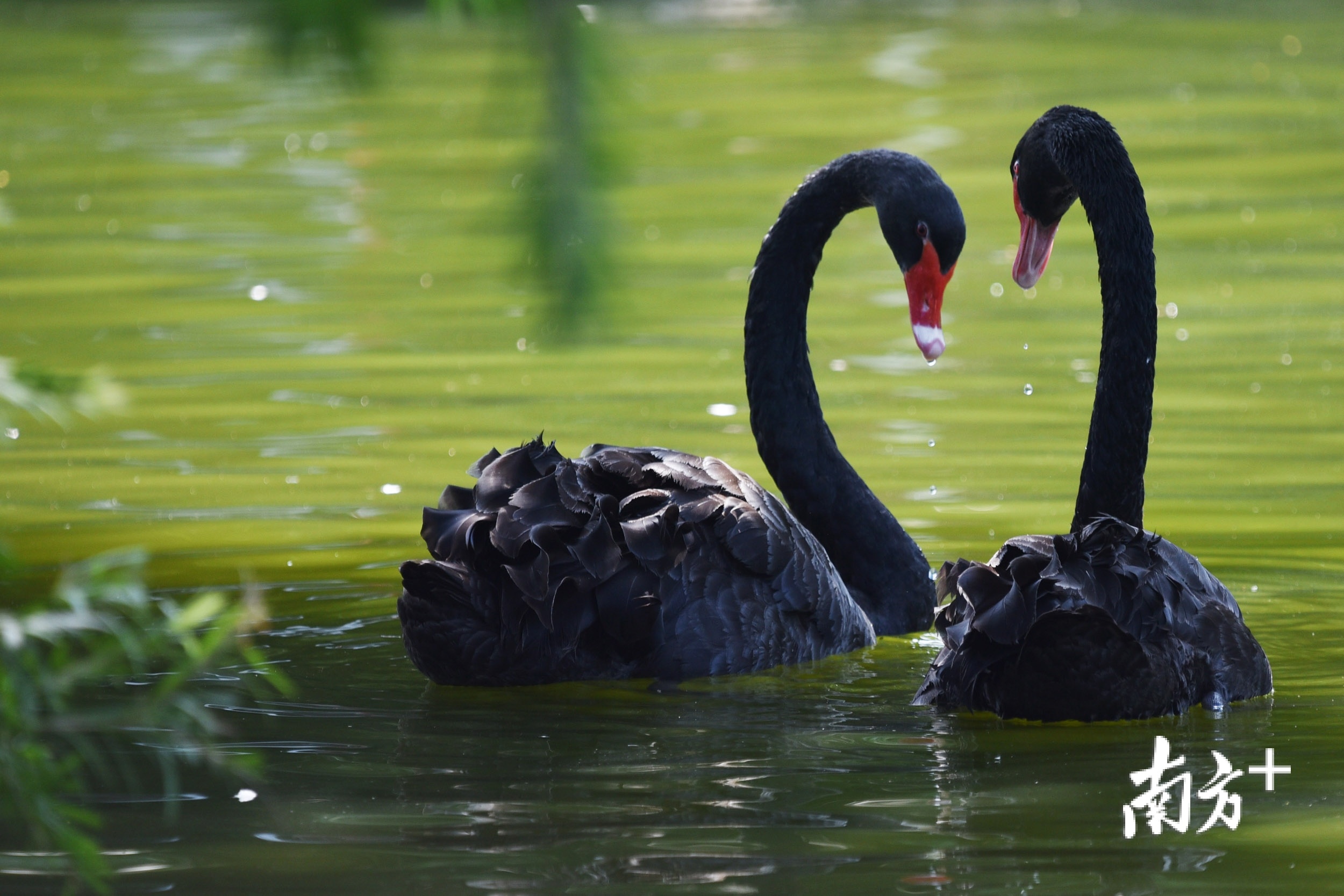 在该园天鹅湖里,成双结对的黑天鹅情侣在树荫的湖面上卿卿我我,以喙相碰形成优美的爱心形,演绎着浪漫的爱情故事。