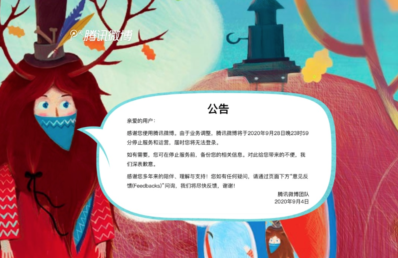 两年后的2020年9月28日,腾讯微博终于要对用户说“再见”。