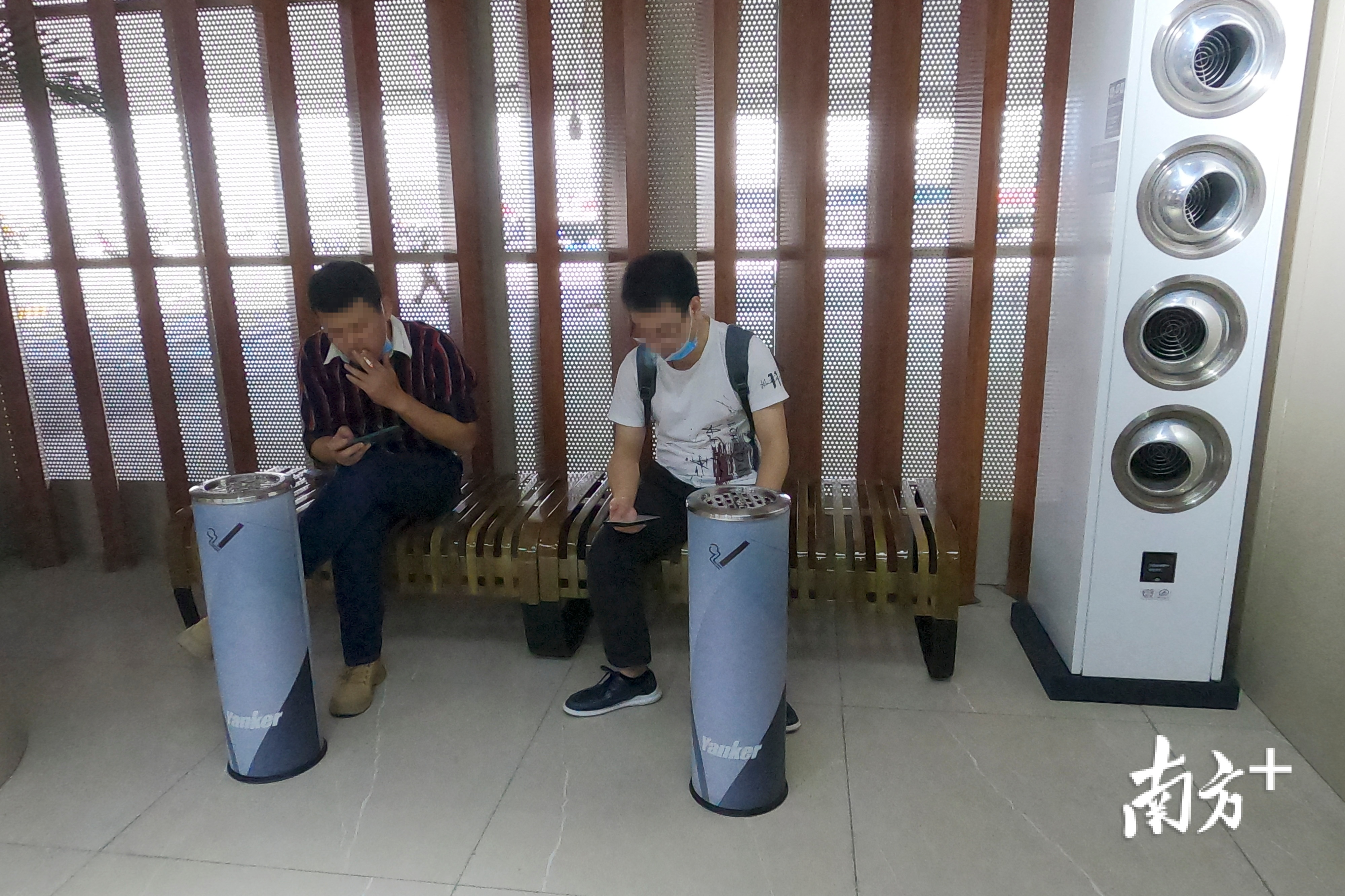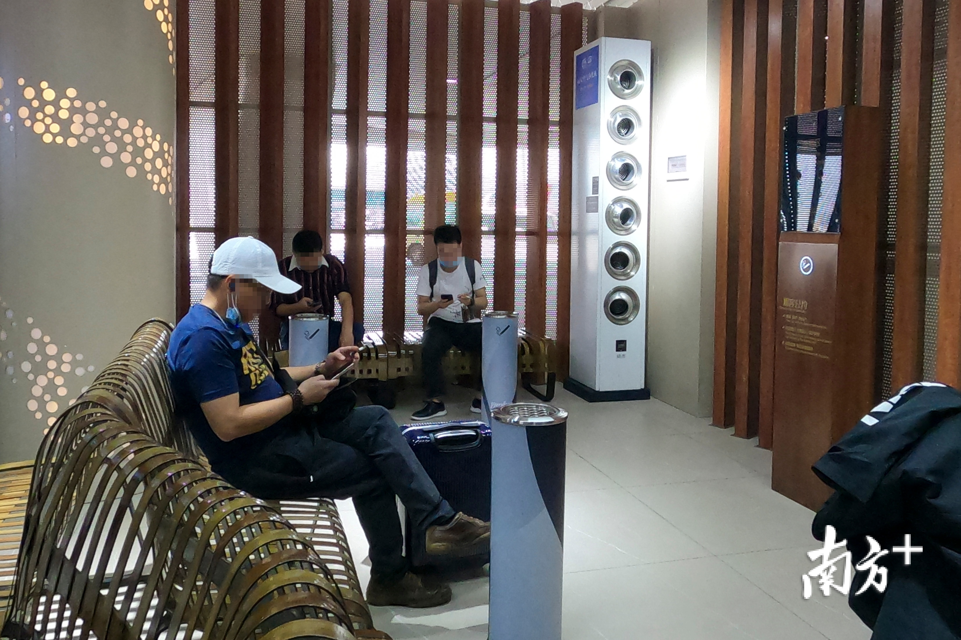 进入吸烟室后,扑面而来的便是一股浓浓的烟味,除了旅客吸烟外,还有穿着带有“深圳机场”字样反光服的工作人员在此吸烟。