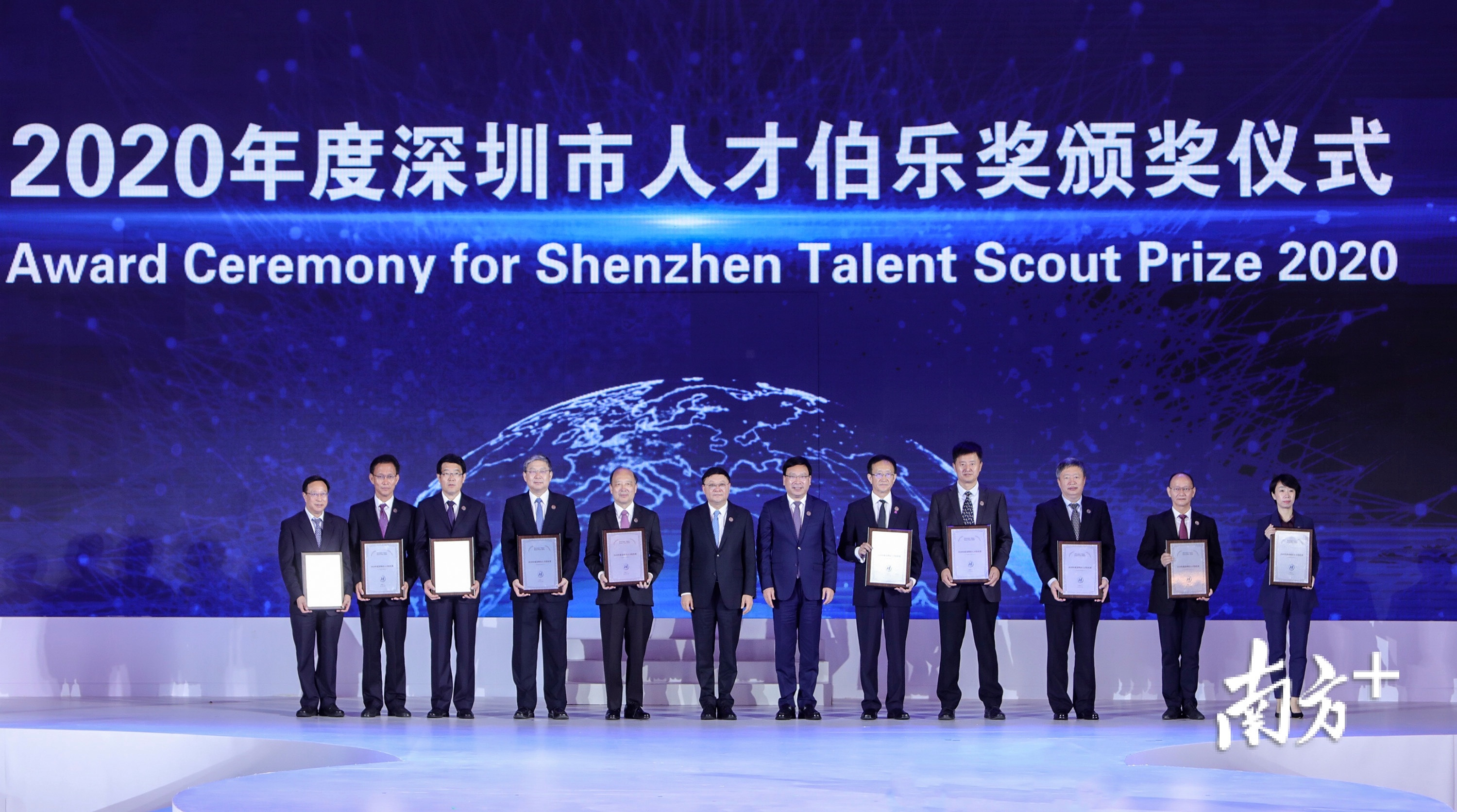 此外,为表彰深圳引才主体在“引才聚智”方面作出的突出贡献,当天深圳市委市政府还评选了2020年度“人才伯乐奖”。南方科技大学、中国科学院深圳先进技术研究院、深圳大学、香港中文大学(深圳)、深圳技术大学、深圳清华大学研究院、中国农业科学院深圳农业基因组研究所、深圳市人民医院、深圳湾实验室、TCL华星光电技术有限公司等10家获奖单位代表颁奖。