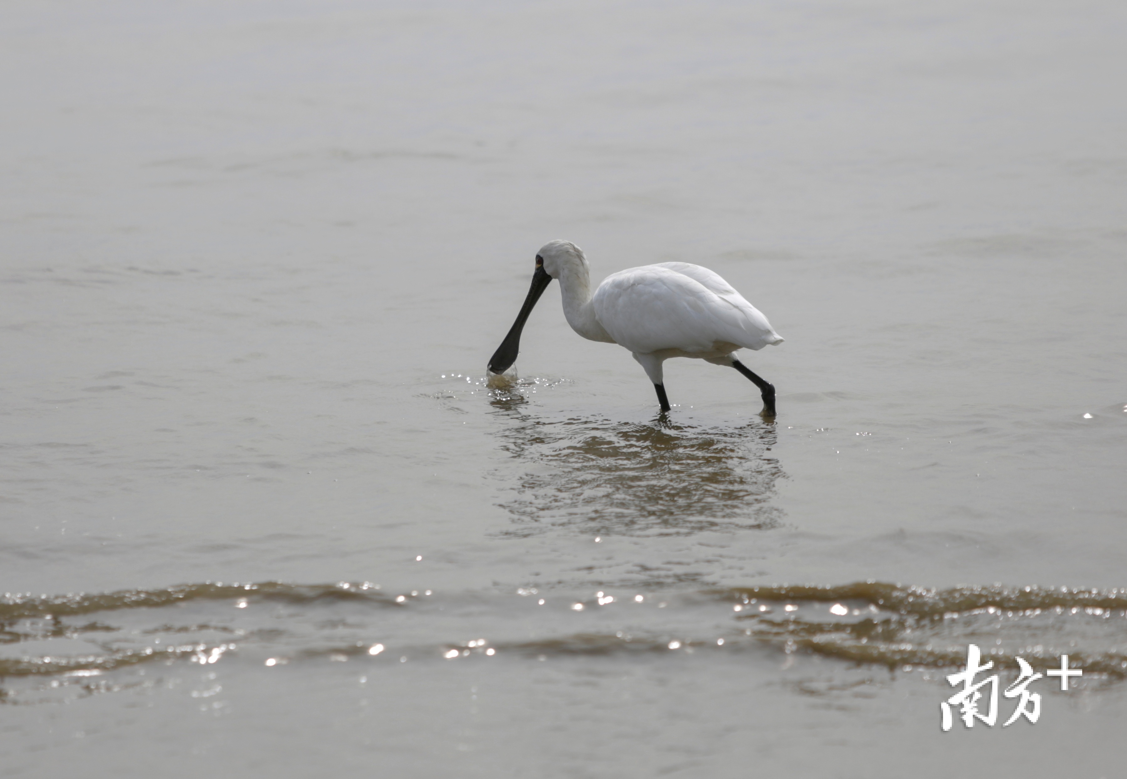 黑脸琵鹭正在深圳湾觅食