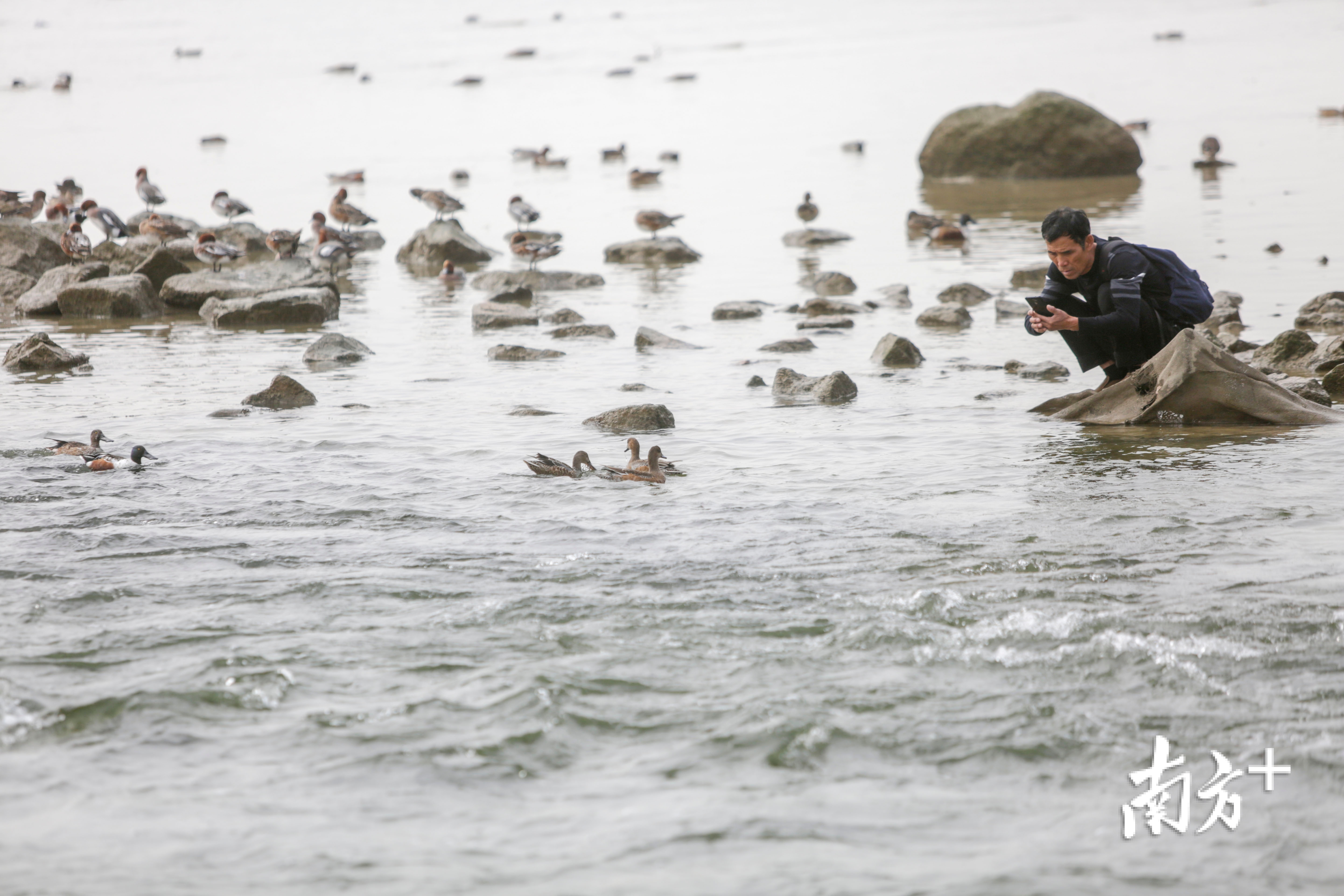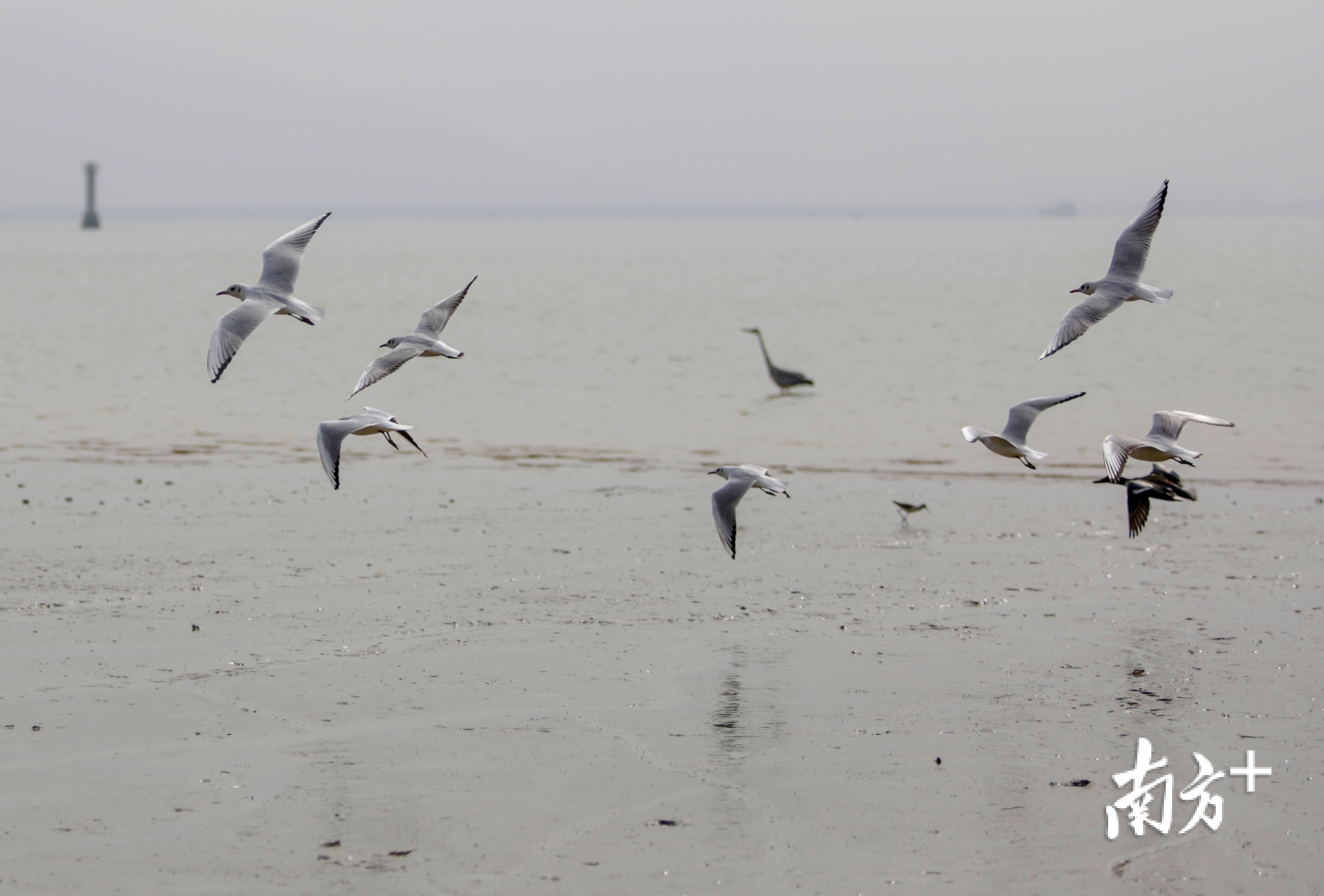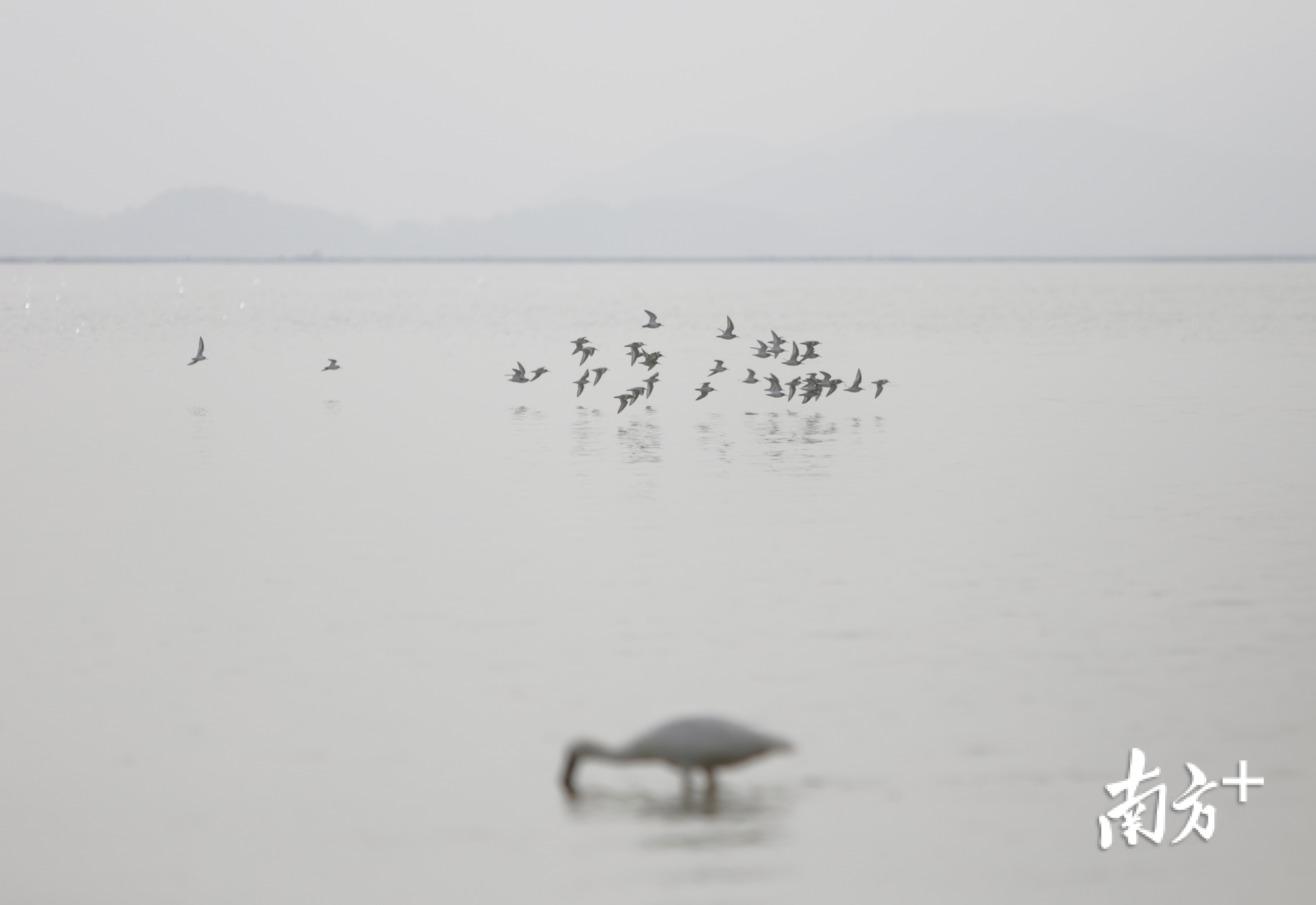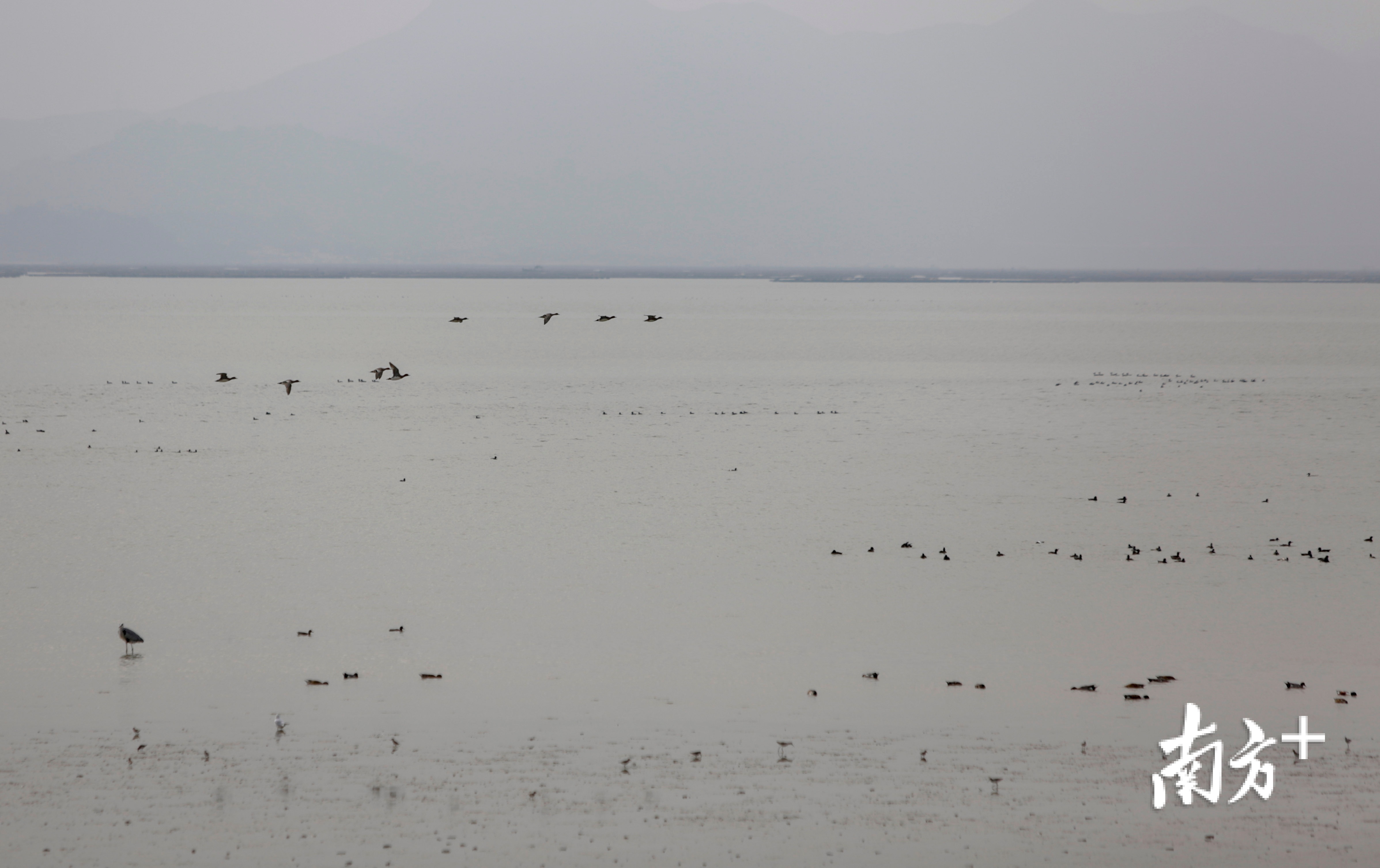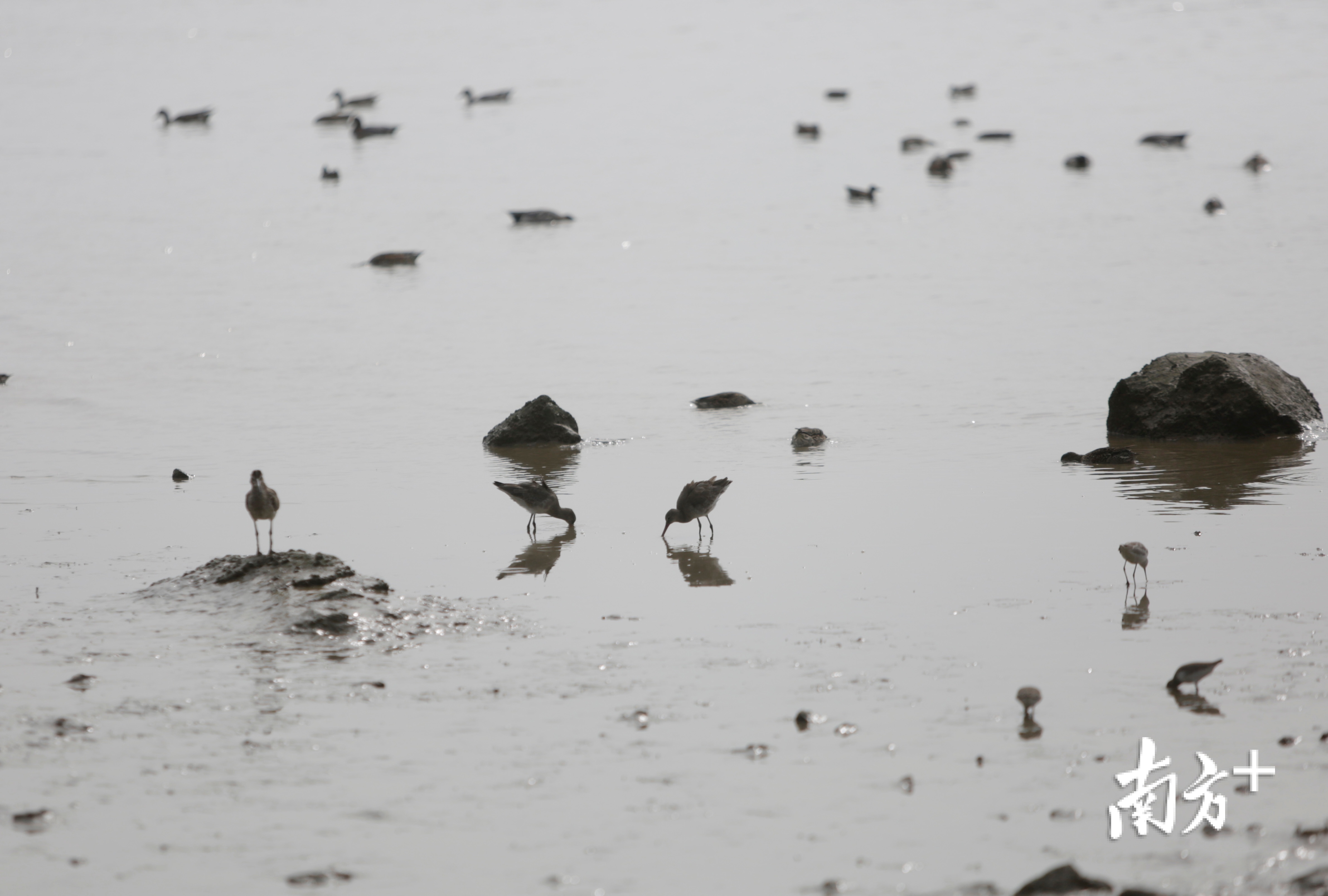 12月9日深圳湾的滩涂上,远远望去密密点点,那些都是候鸟。