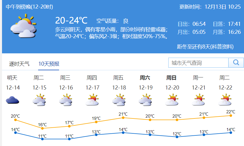 12月13日,记者从深圳气象局获悉,明日将有一股较强冷空气抵达华南沿海。受其影响,深圳明日阴天有零星小雨,北风加大,到傍晚时分会出现气温骤降。尤其是到15、16日早晨,最低气温将降至11℃左右,天气显著转冷,秋裤可以派上用场啦!