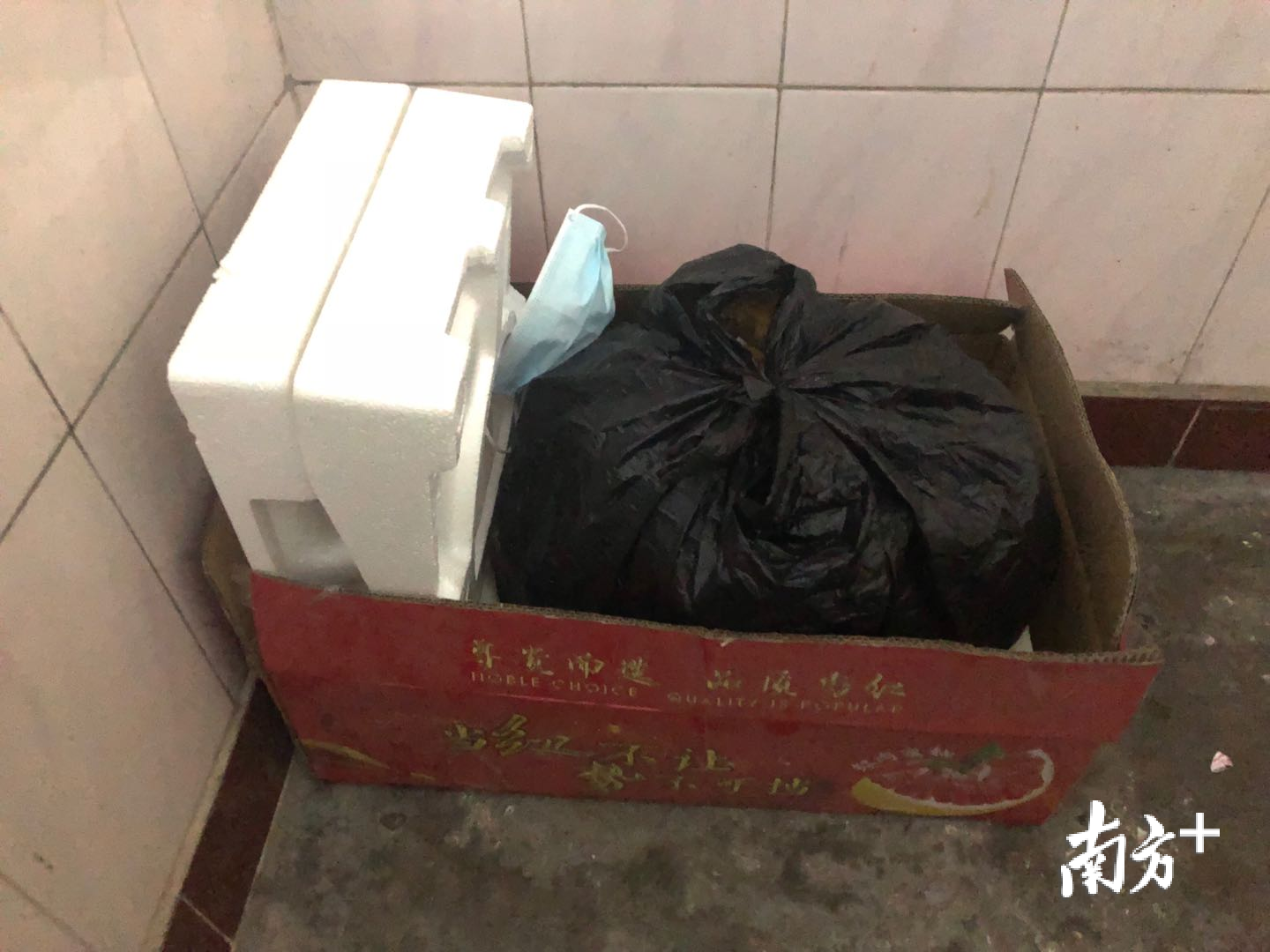 立新花园楼梯拐角的平台层处,整包的垃圾、废弃口罩、泡沫等用纸箱装着扔在角落处。