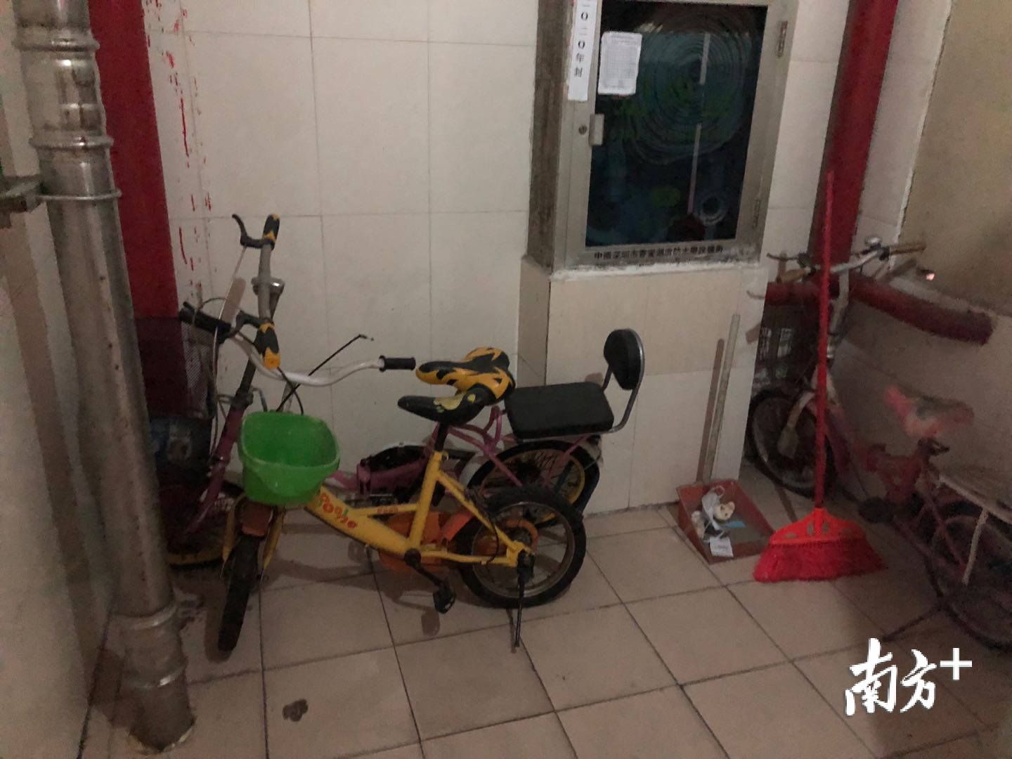 但楼梯间内依旧堆放着不少杂物和垃圾,其中包括废弃木板、旧自行车等,还放有一个垃圾铲和扫把,垃圾铲上装着废弃口罩、纸巾等垃圾。