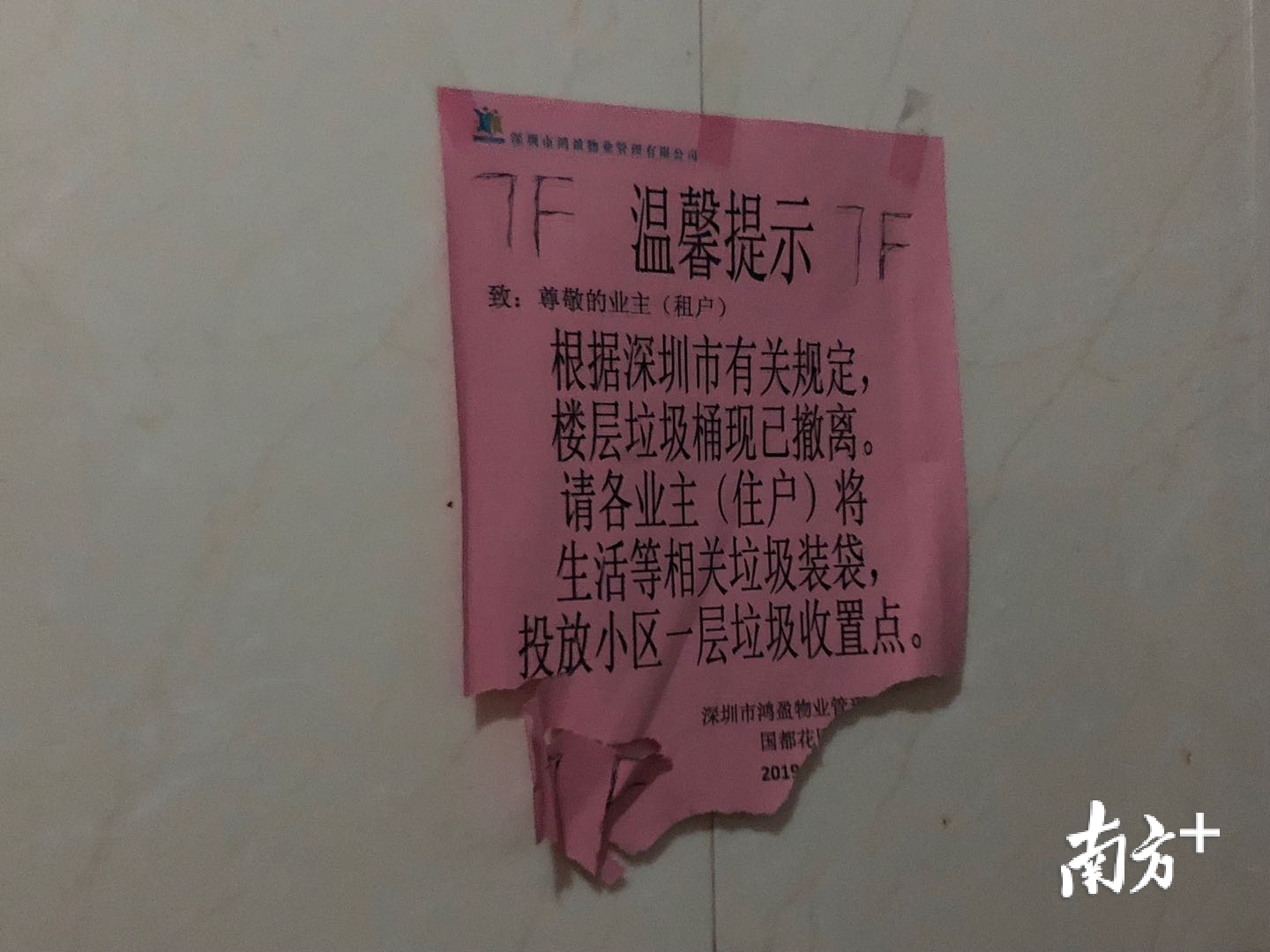 在桂园街道的国都花园,一处楼梯间的墙上张贴着撤桶的相关告示,告示上写明“根据深圳市有关规定,楼层垃圾桶现已撤离。请各业主(住户)将生活等相关垃圾装袋,投放小区一层垃圾收置点。”