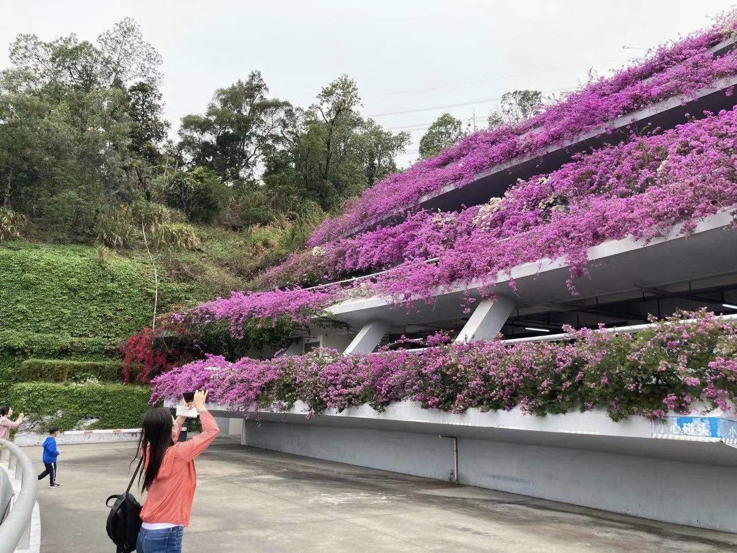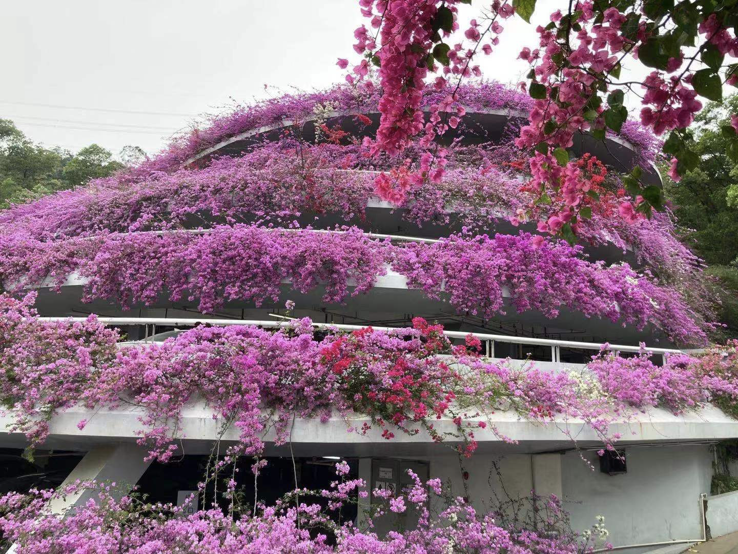 仙湖植物园公交站,又是停车场,每层车库栏杆种满了簕杜鹃,每到春季,鲜花盛开,成为深圳最漂亮的公交站。市民调侃,这么漂亮的停车场,花开季节应该多收点停车费。