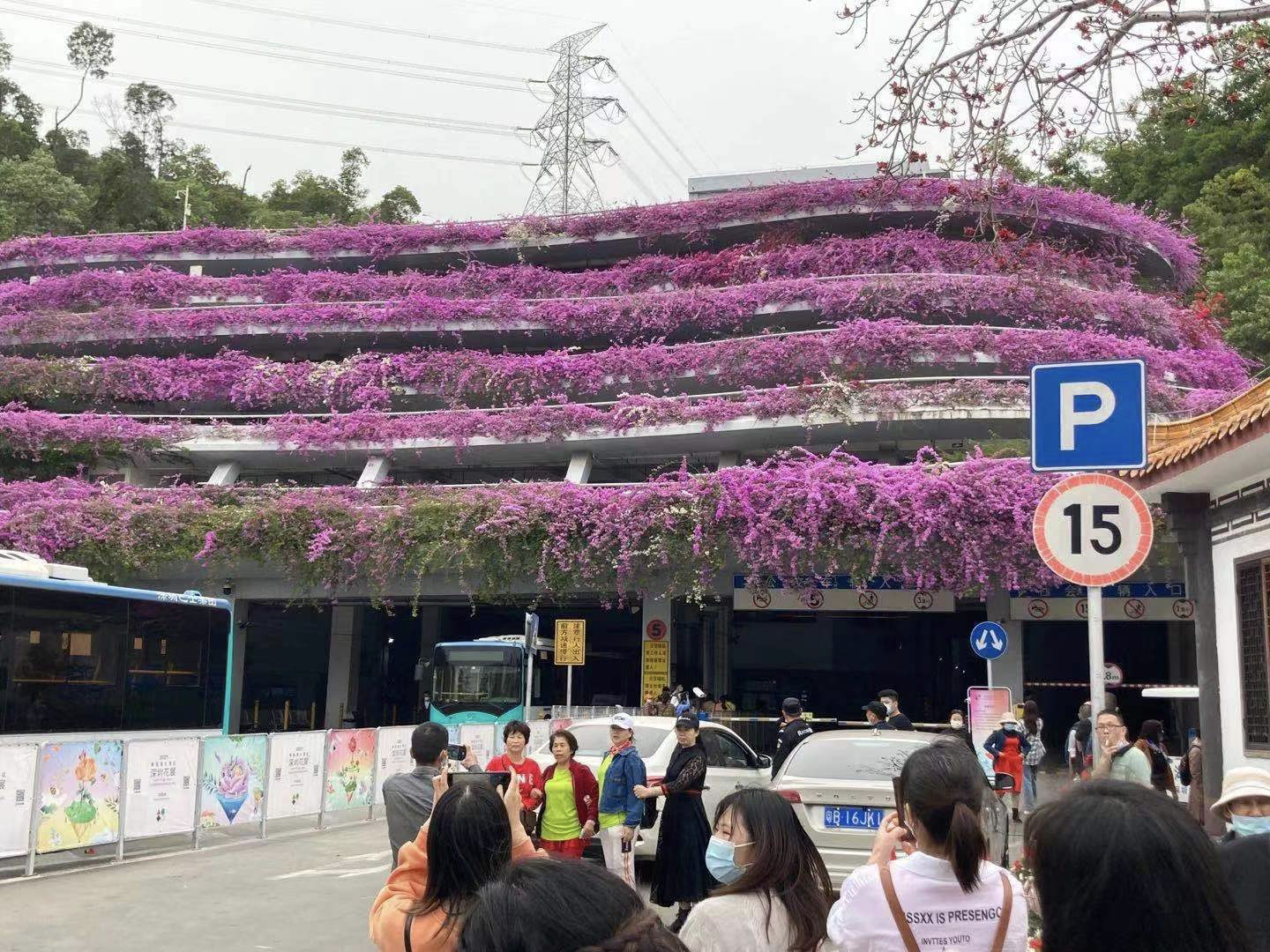 在门口公交总站停车场外,停车场有七层,层层叠叠的簕杜鹃花开正艳,很多市民聚集在停车场下拍照,还有结对的市民沿着台阶走上停车场与花合影留念。