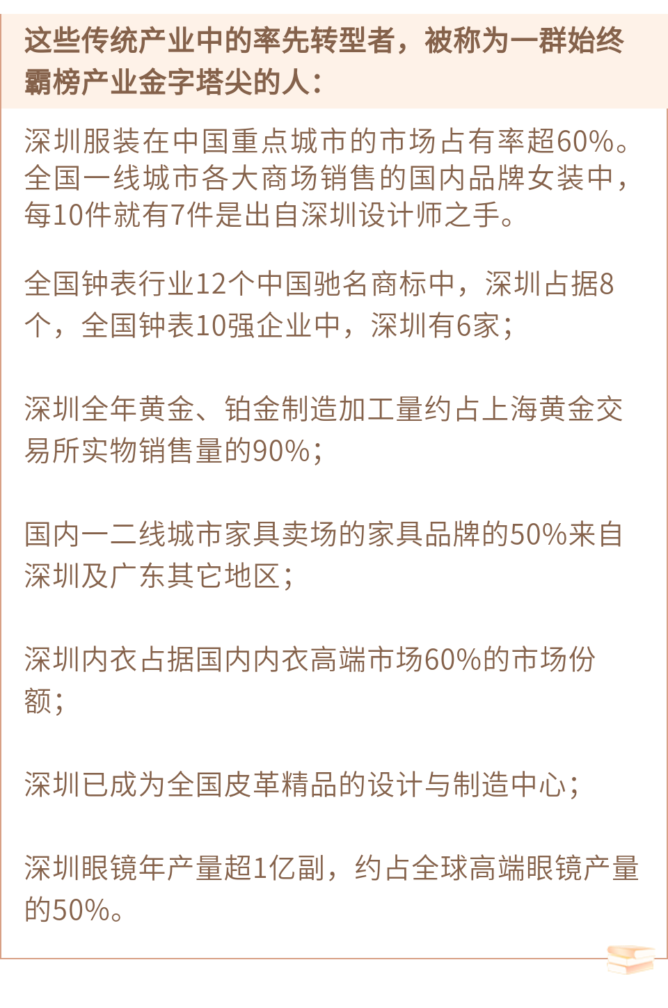 与此同时,深圳以技术高端化、创意多元化、产品时尚化、品牌国际化为转型方向,引领传统产业“老树发新芽”,带动一批深企霸榜产业“金字塔尖”。