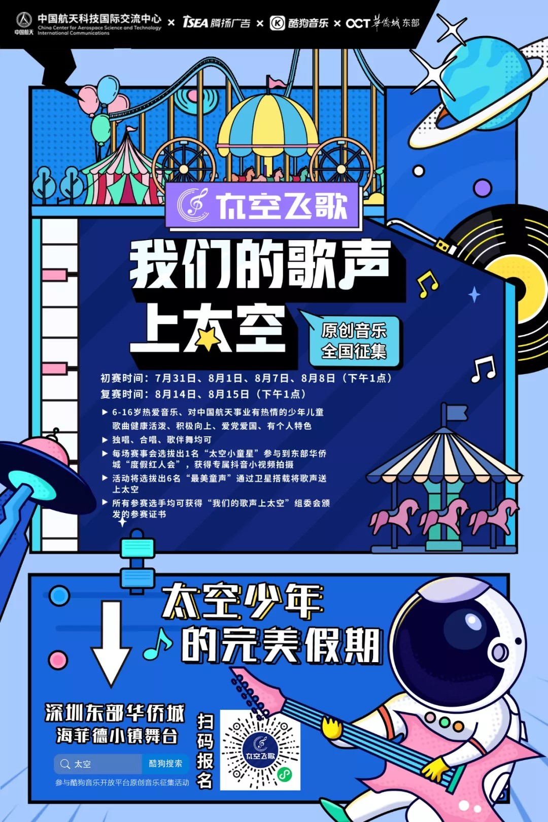 又是一年蝉鸣蛙叫的盛夏,甜蜜的暑期长假如期而至,恰逢一年一度的华侨城文化旅游节,如火如荼地开展,这个暑期东部华侨城向你发来夏日缤纷假期邀请函。圆梦舞台,仰望星空,我的歌声也要上太空。东部华侨城联手中国航天科技国际交流中心、酷狗音乐等机构合作共计6场 “最美童声”才艺红人选拔赛海选比赛,让孩子圆梦舞台!上酷狗音乐搜索“太空”。参与酷狗音乐开放平台音乐征集活动!最美童声将有机会伴随最纯真的祝福,跟随卫星一同发射上太空,让天籁童声为无垠宇宙增添一抹别具一格的色彩。东部华侨城力图为广大游客及参赛小选手们,呈现一场美轮美奂的青春视觉盛宴。暑期在东部华侨城,一起放飞梦想,圆梦舞台!
