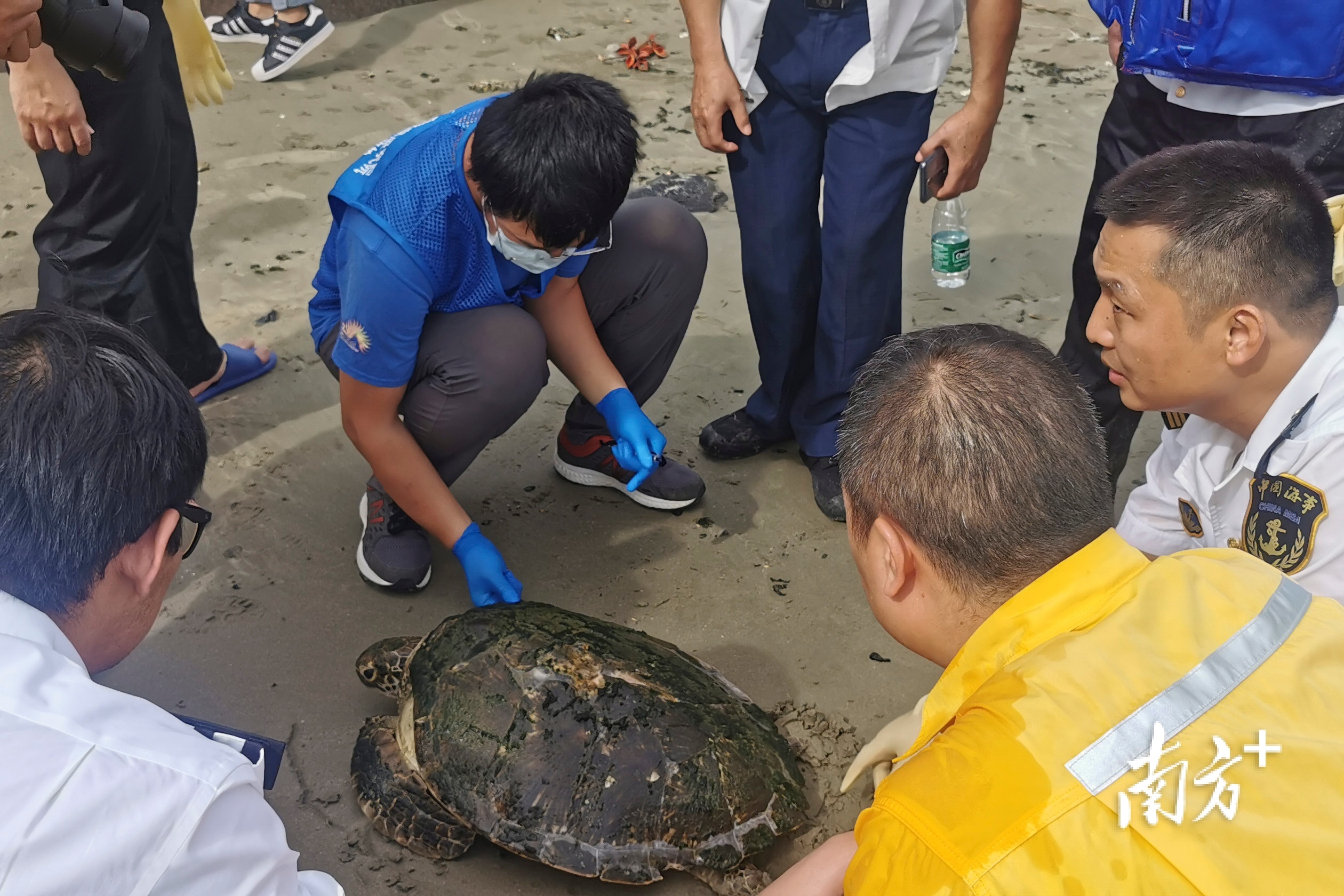 7月30日,一只绿海龟在深圳市深汕特别合作区小漠海滩搁浅,患有脱肛感染和背部腐甲等症状,被送往广东海洋大学深圳研究院救助基地进行治疗。据介绍,这是近20年来首次在深汕海域发现搁浅的绿海龟。