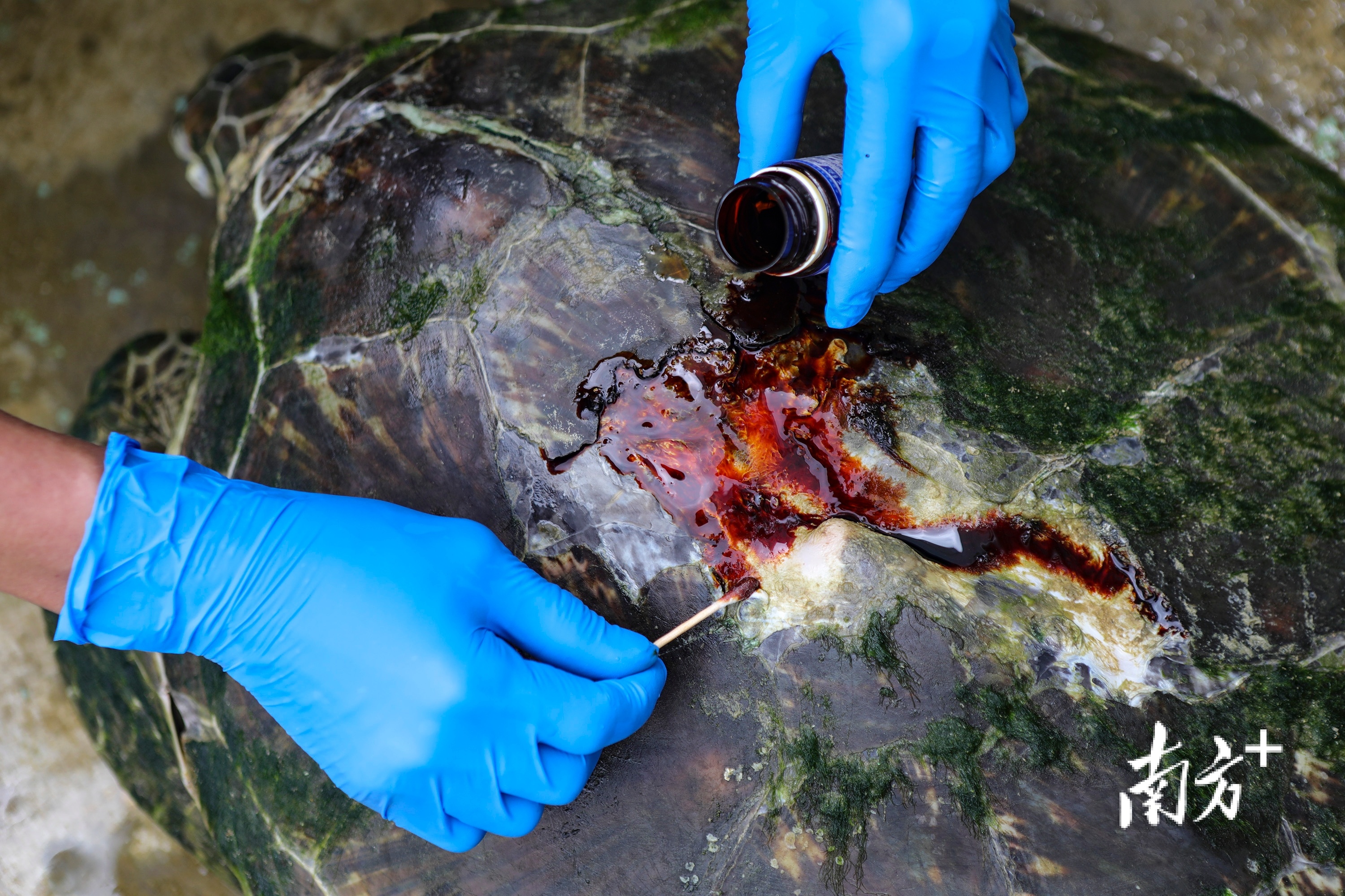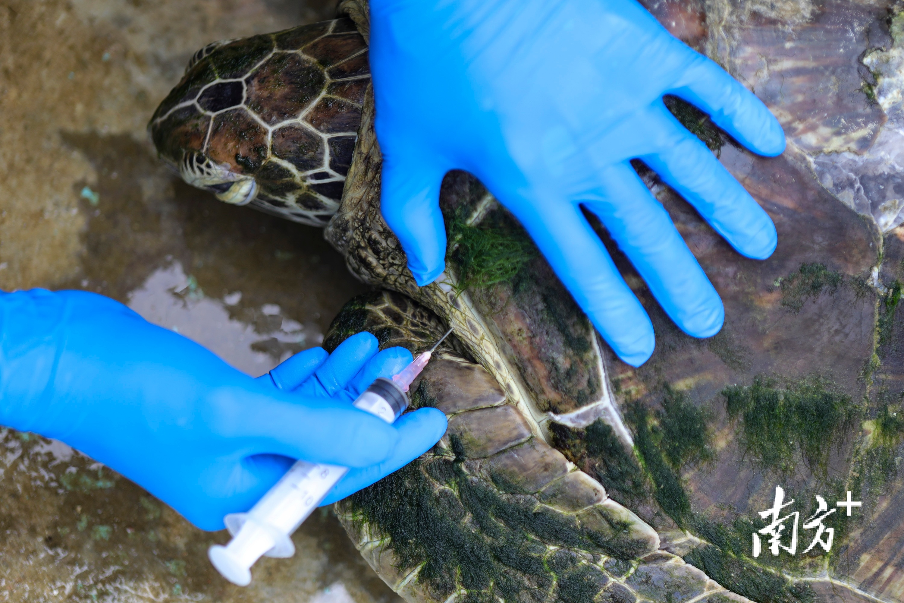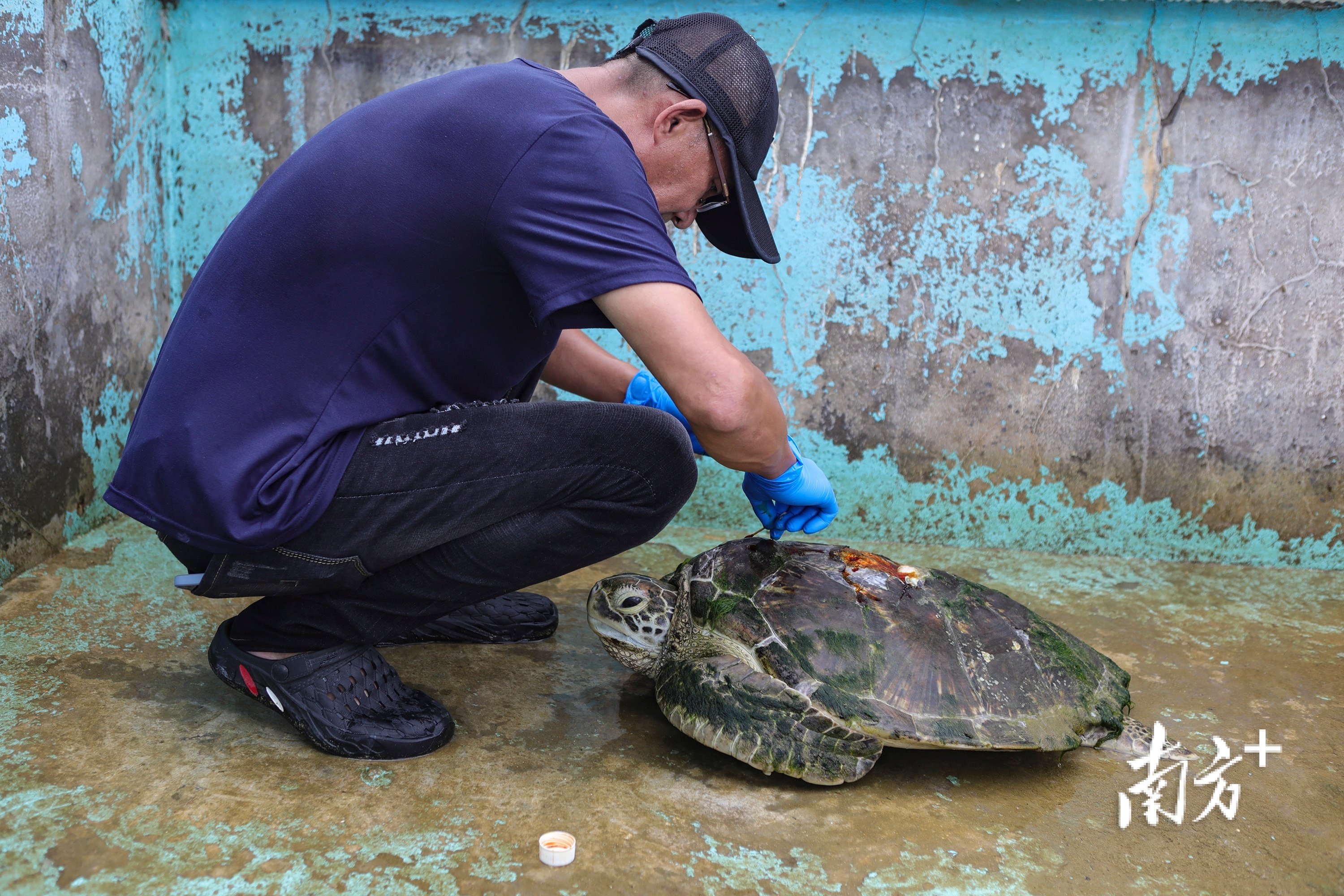 “我到这里3年了,这是我救治过的海龟中受伤最严重的一只,但它幸运存活下来了,实属不易。”海龟保育员张凯富说,目前绿海龟受伤龟壳的炎症逐步消退,伤势恢复情况良好,他们每3天给绿海龟注射抗生素和伤口消毒,未来将根据绿海龟的恢复情况调整治疗方式。