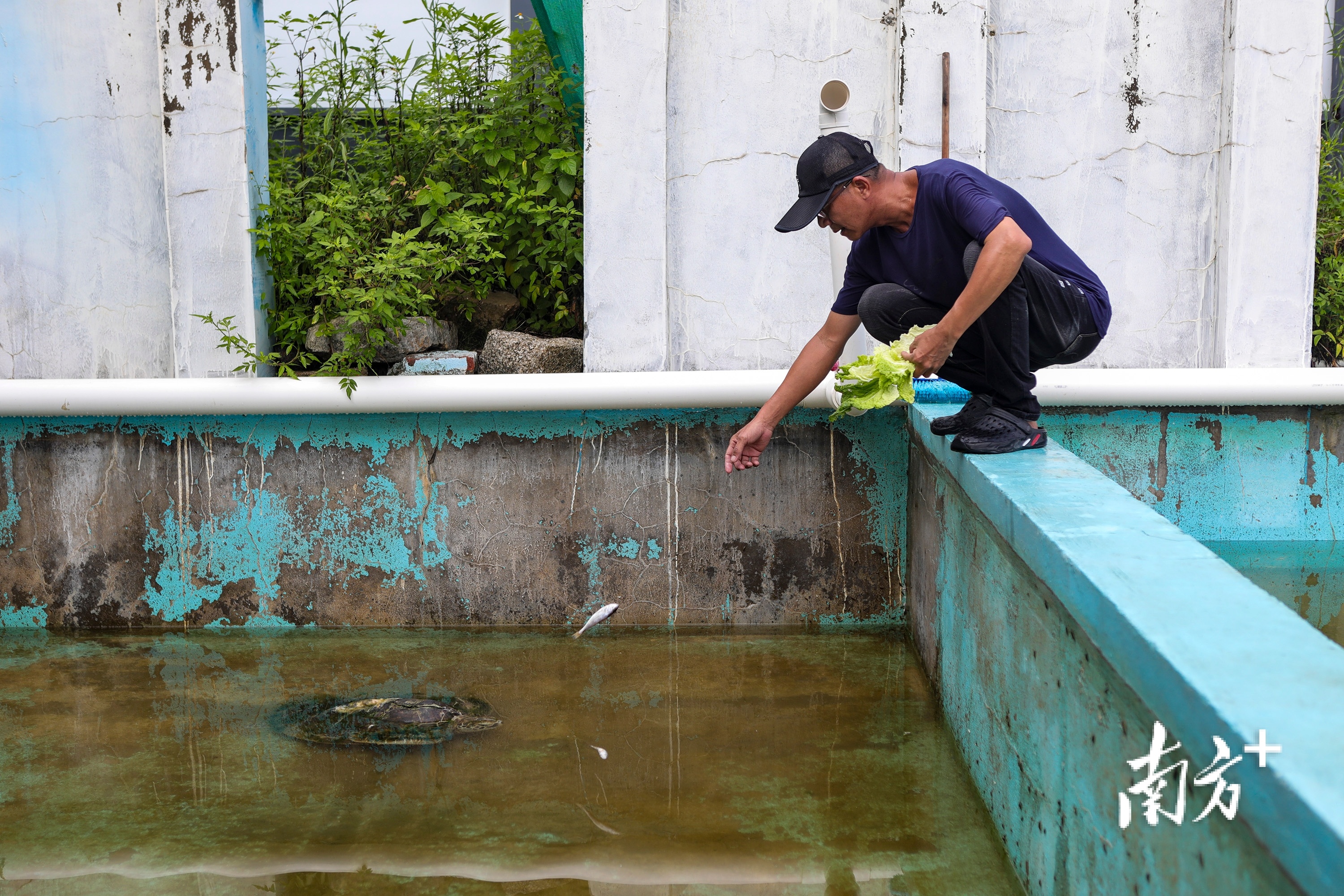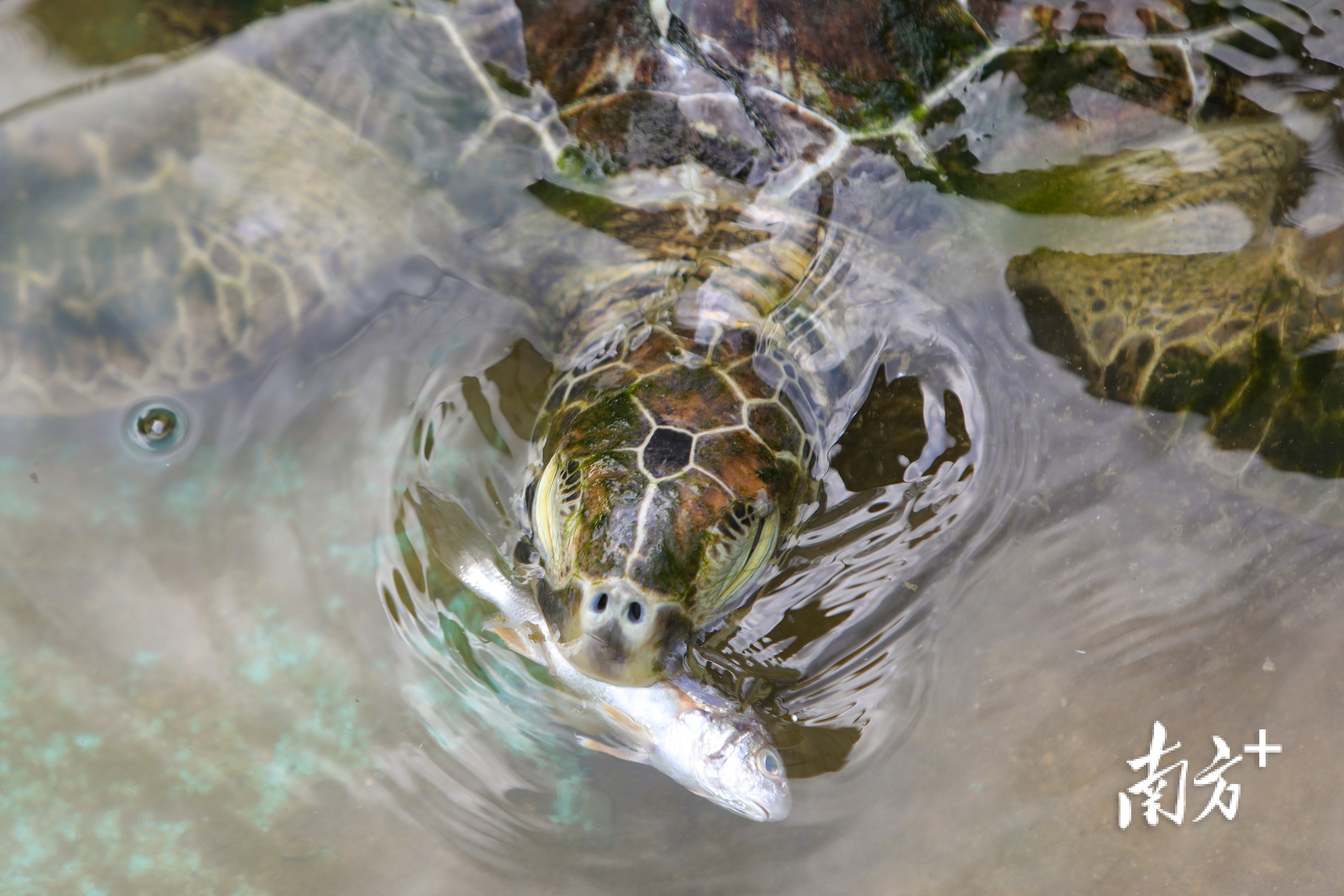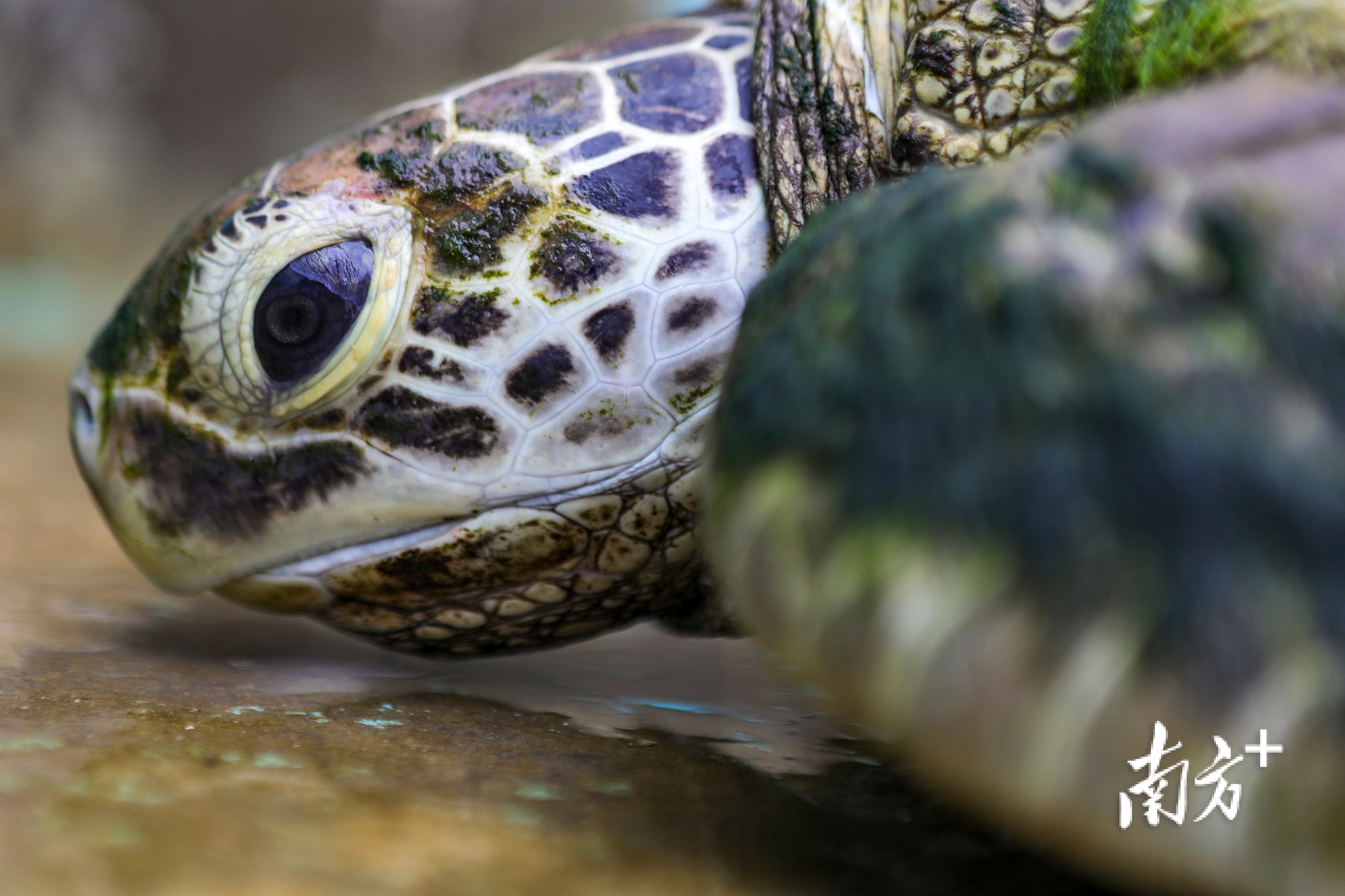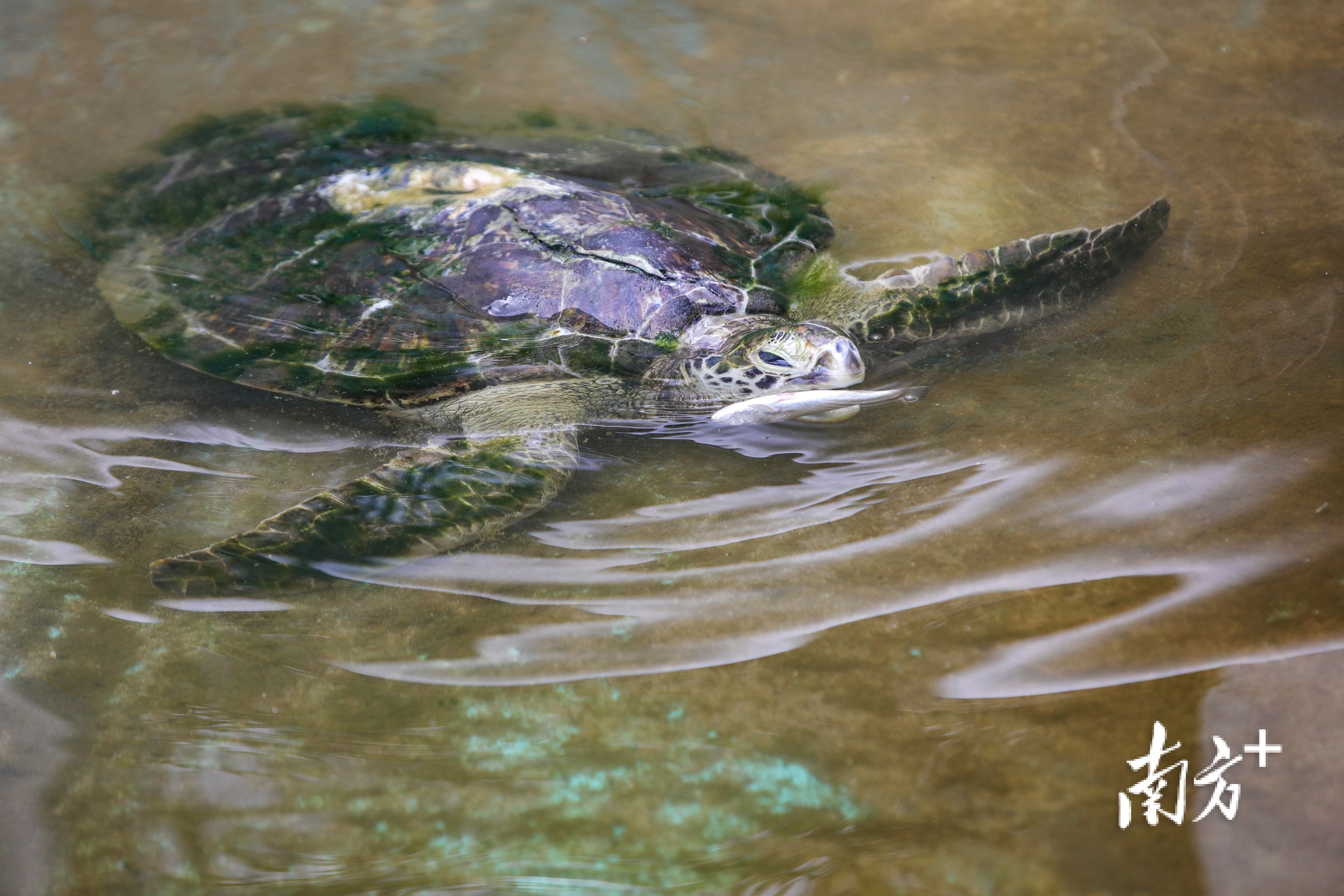 8月9日上午,南方+记者来到位于大鹏新区的广东海洋大学深圳研究院水生野生动物救护基地,现场获悉,在深汕海域搁浅获救的绿海龟伤势恢复良好,最爱吃白菜和小鱼,大家亲切喊它“龟坚强”。
