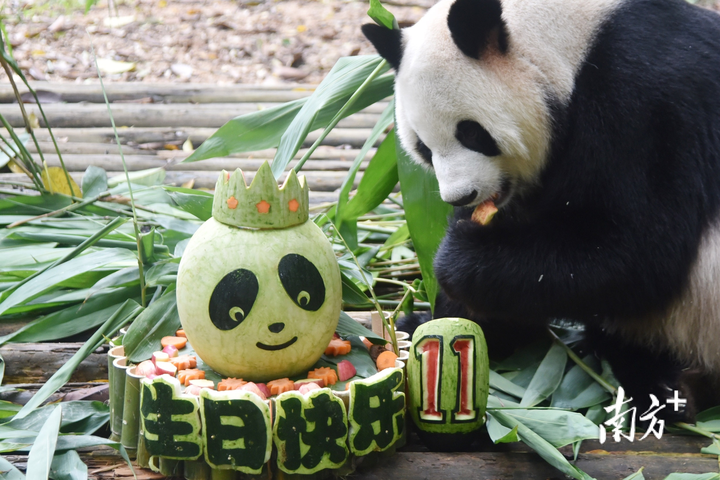 当天上午,该园为大熊猫“园舟”举办了别开生面的生日会,还送上特制的精美“水果蛋糕”,蛋糕外皮采用新鲜竹子、西瓜拼成,整只西瓜外皮雕刻的卡通大熊猫图案格外醒目,中间填满了“园舟”爱吃的食物,顶层用水果制作了“生日帽”,烘托生日气氛。整个“蛋糕”绿色环保,祝愿“园舟”在深圳健康生活。