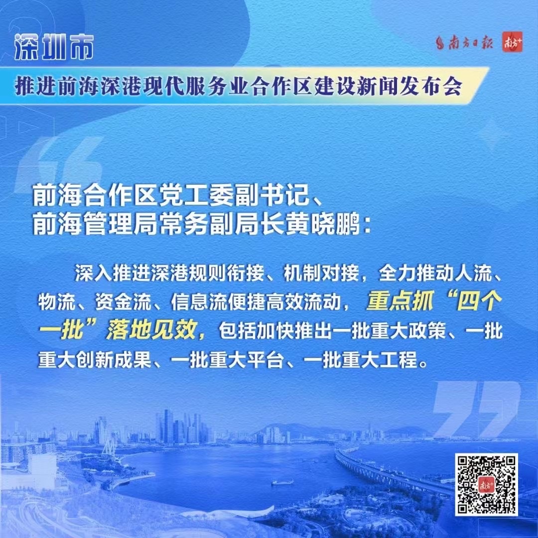 “前海将深入推进深港规则衔接、机制对接,全力推动人流、物流、资金流、信息流便捷高效流动。”9月13日,深圳市政府新闻办举办“推进前海深港现代服务业合作区建设新闻发布会”,前海合作区党工委副书记、前海管理局常务副局长黄晓鹏表示,《全面深化前海深港现代服务业合作区改革开放方案》明确了新时代前海发展的任务书、时间表、路线图,近期前海就将重点推动“四个一批”落地见效,包括加快推出一批重大政策、一批重大创新成果、一批重大平台、一批重大工程。
