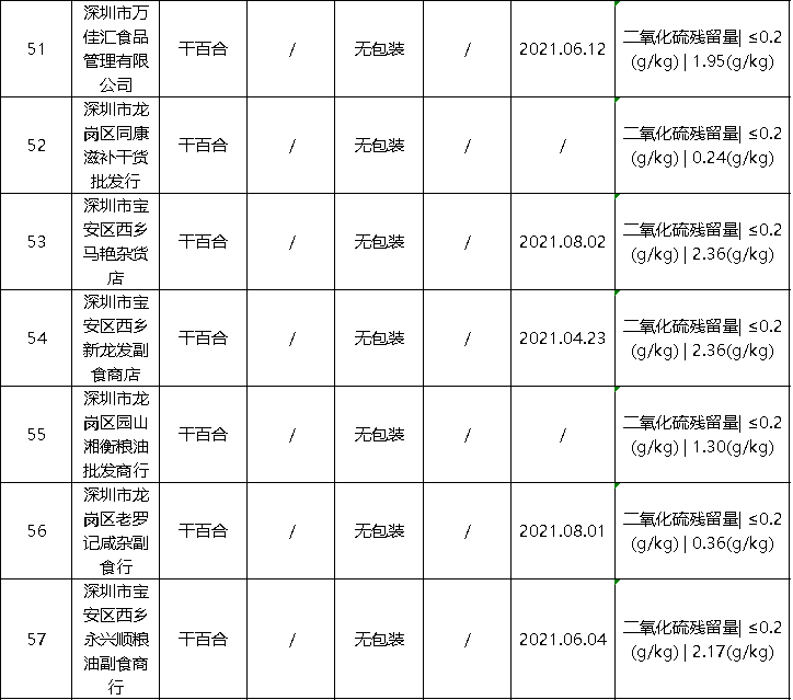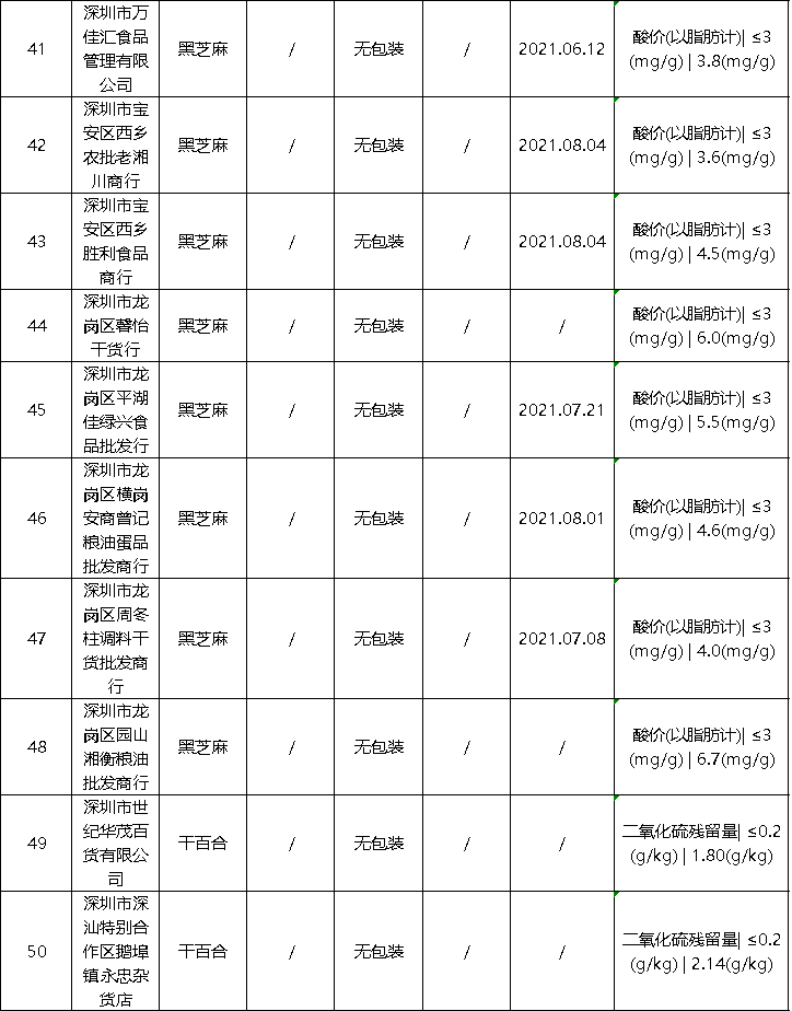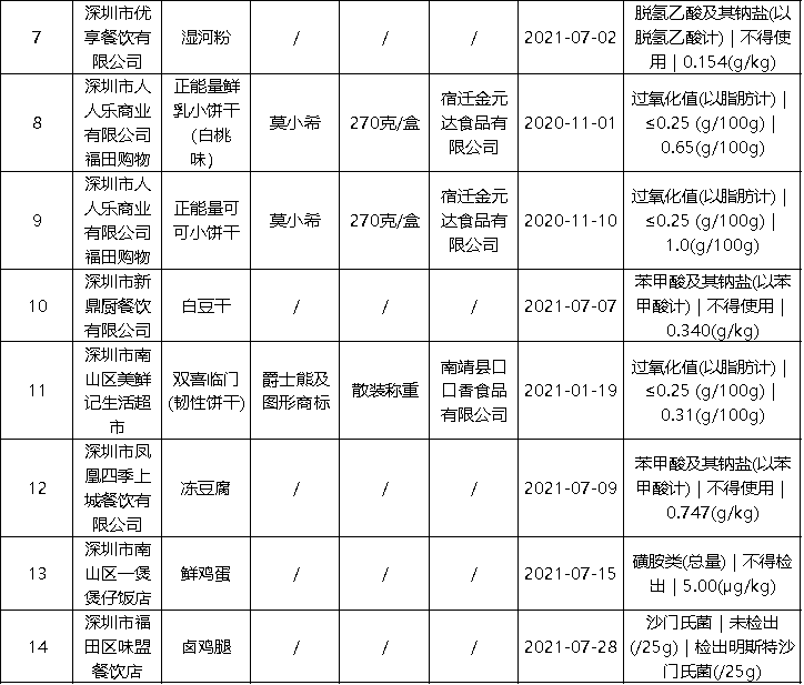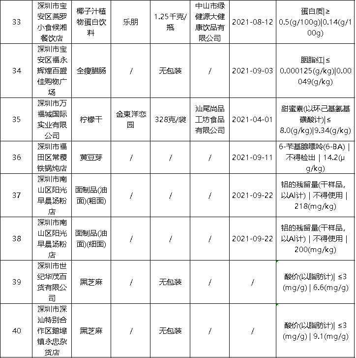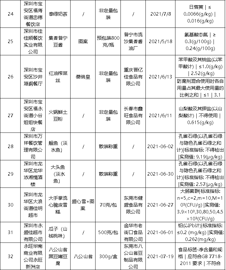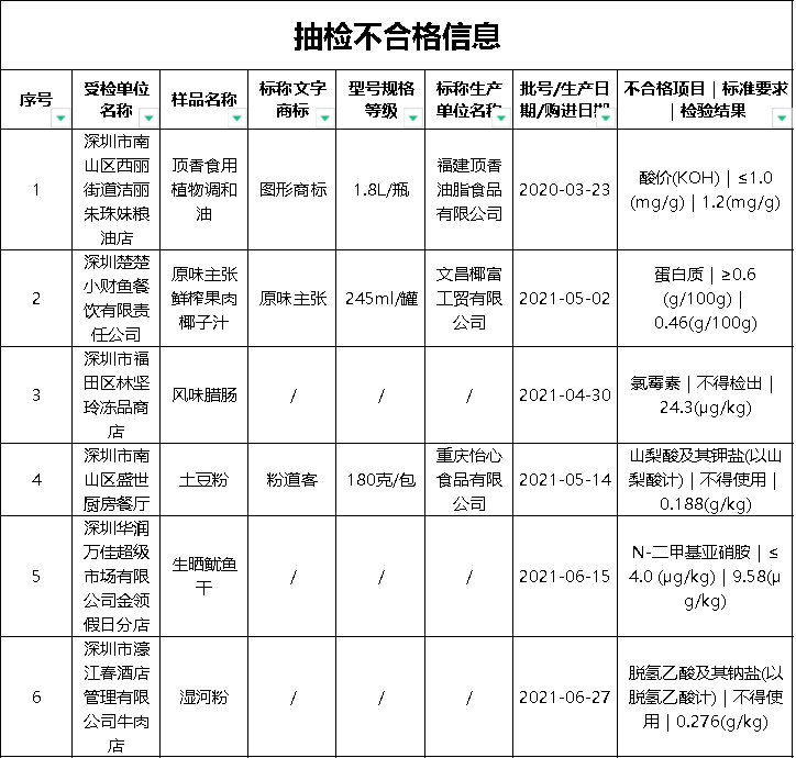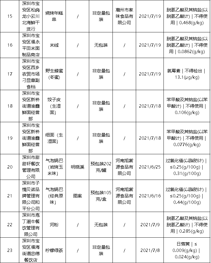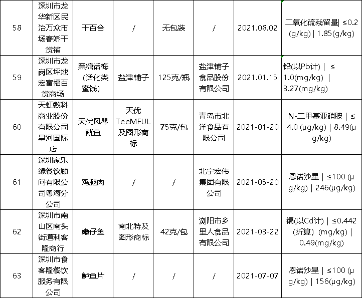 近日,深圳市市场监督管理局公布最新食品安全抽样检验情况通报,发现63批次不合格样品,部分不合格样品来自华润万佳、天虹等知名商场。此次通报的食品共4425批次,涉及经营主体1402家,共检测食品指标45090项次, 发现不合格样品63批次。