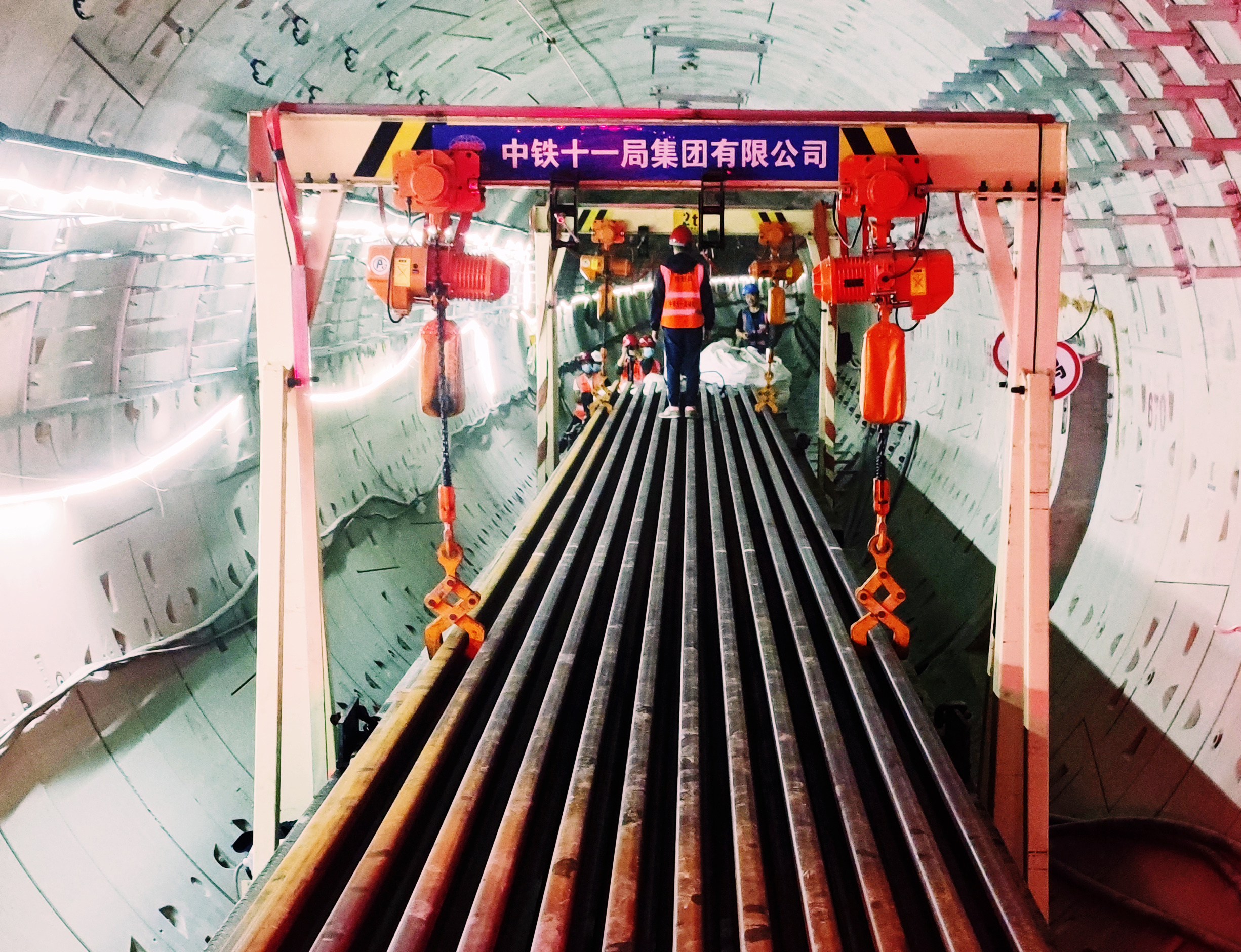 相比于拖拉式铺轨方案和轮胎式铺轨设备,新型龙门吊铺轨模式在地铁隧道内占用空间小,满足后续专业限界要求,为系统、机电设备安装等专业提供了施工空间,能快速度、高效率完成铺轨,保证整体工期节点。