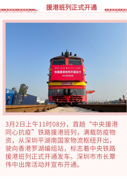 当前,香港疫情严峻,根据中央对香港疫情发布的重要指示,为保障香港物资供给渠道畅通,助力援港抗疫工作,在香港特区政府与深圳市委市政府双方多个部门以及深圳海关、深圳边检、广铁集团、中铁集装箱广州分公司等多个相关单位协同努力下,一周时间内共同完成了班列开通运行各项筹备工作。
