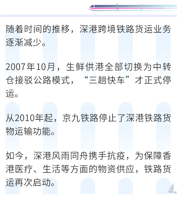 中央铁路援港班列的正式开通也标志着沉寂10多年的供港跨境铁路货运列车正式恢复运营。
