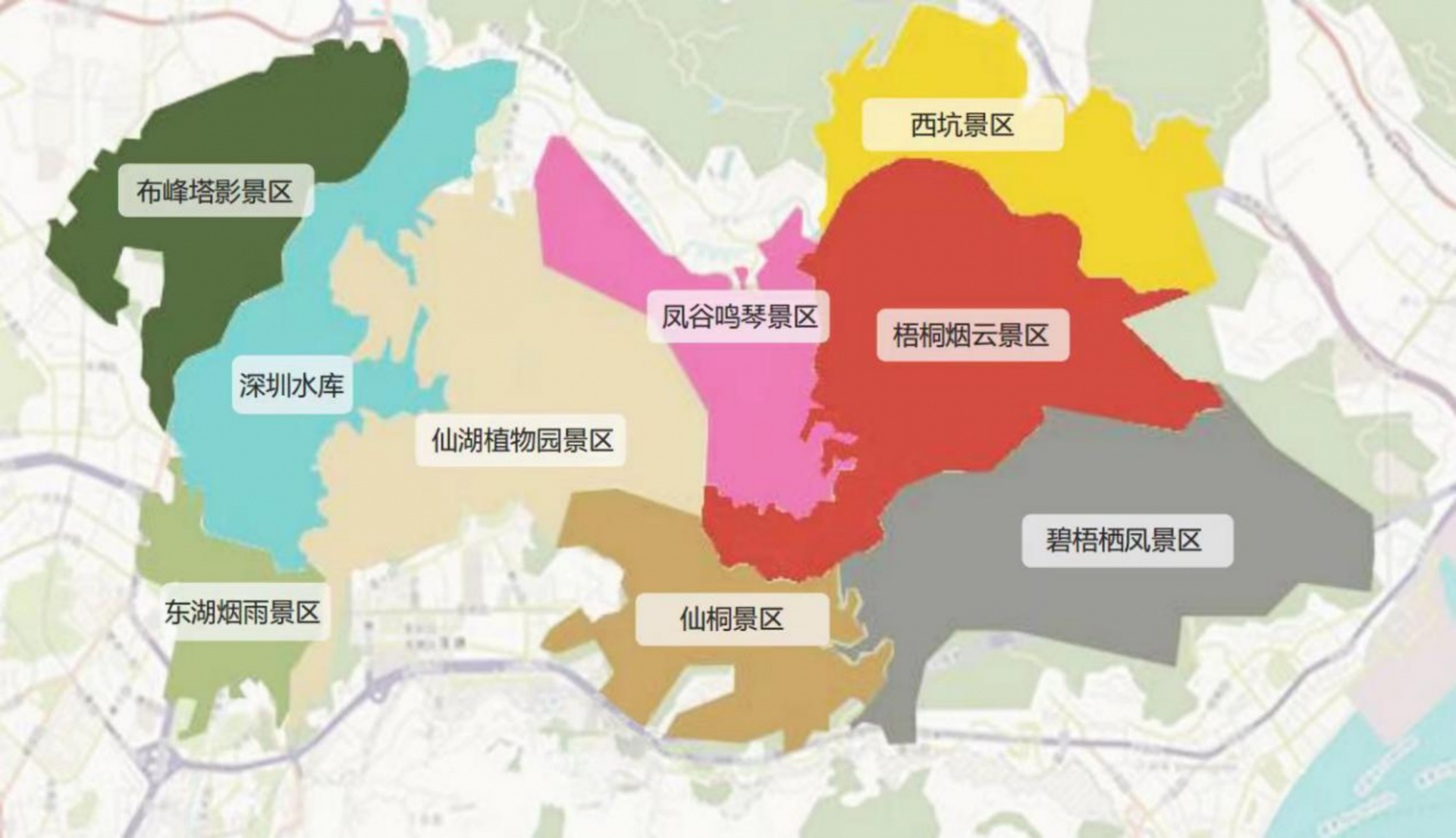 原来,梧桐山国家级风景名胜区总体规划面积42.04平方公里,包括梧桐烟云、凤谷鸣琴、西坑景区、仙桐景区、仙湖植物园、东湖烟雨(东湖公园)、碧梧栖凤(大部分区域位于广东梧桐山国家森林公园,即广东省沙头角林场)、布峰塔影(布心山郊野公园)等八大景区和深圳水库。