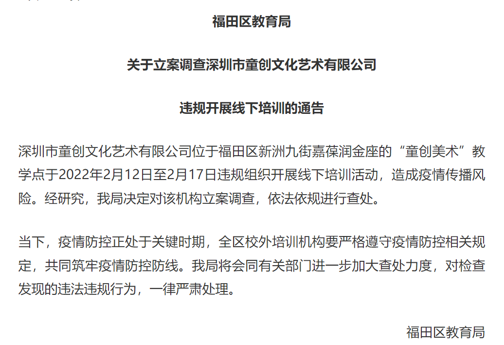 深圳市童创文化艺术有限公司位于福田区新洲九街嘉葆润金座的“童创美术”教学点于2022年2月12日至2月17日违规组织开展线下培训活动,造成疫情传播风险。经研究,福田教育局决定对该机构立案调查,依法依规进行查处。