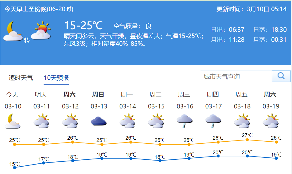 今日天气:晴天间多云,天气干燥,昼夜温差大;气温15-25℃;东风3级;相对湿度40%-85%。