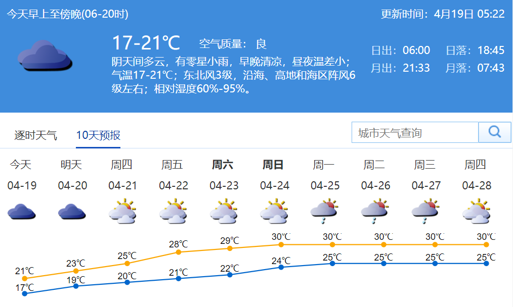 今日天气:气温17-21℃;阴天间多云,有零星小雨,早晚清凉,昼夜温差小;东北风3级,沿海、高地和海区阵风6级左右;相对湿度60%-95%。