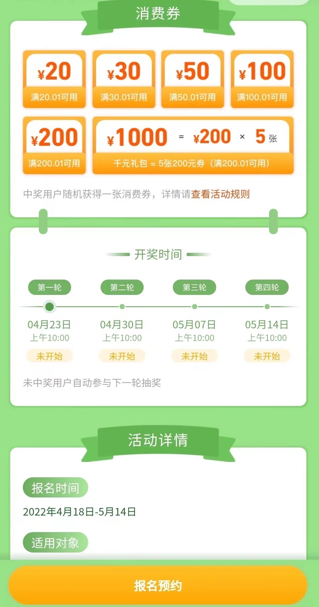 “春暖花开,龙岗有礼!”备受市民关注的龙岗区消费券今日正式开启预约报名抽奖!本次发放的消费券分别设置了20元、30元、50元、100元、200元、1000元共六种面值的消费券,其中1000元面值由5张200元券组成。