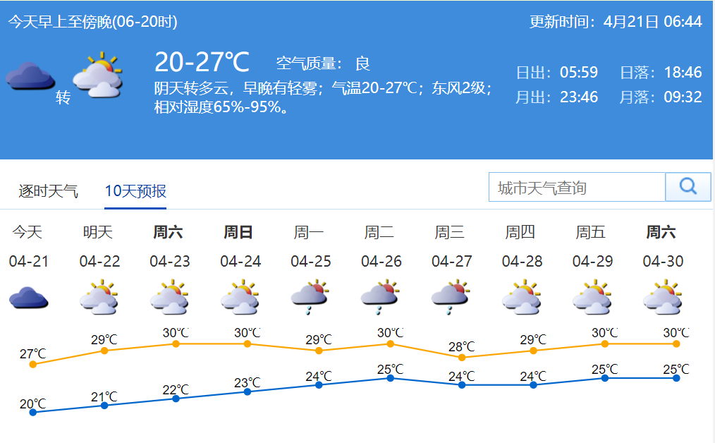 今日天气:气温20-27℃,阴天转多云,早晚有轻雾;东风2级;相对湿度65%-95%。